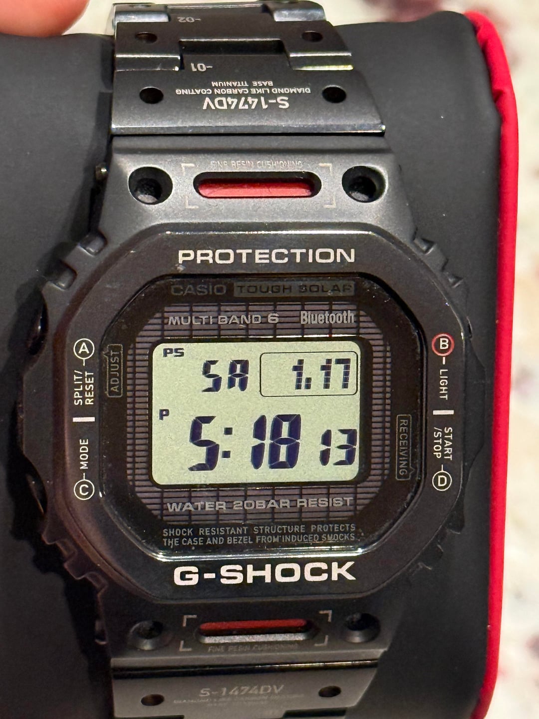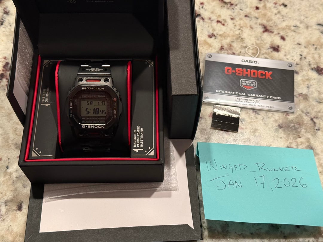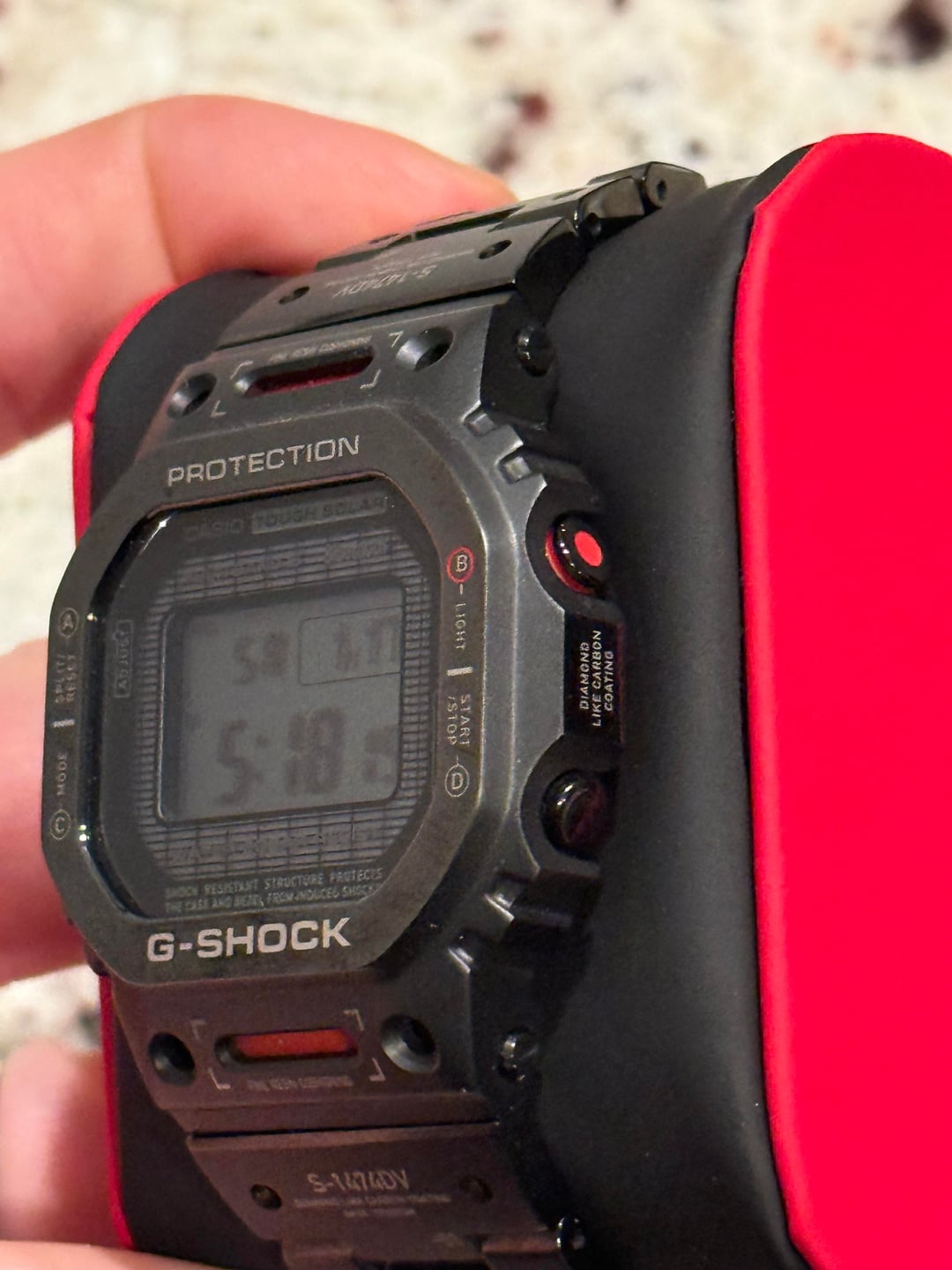 Hello r/watchexchange, I’m offering up for sale a GShock GMW-B5000-TVA for $2100 Sized for a 7.1 inch wrist but includes full links Excellent condition and one of / if not the cheapest on the market Complete with box and papers Images/ Timestamp included in the post Price: $2100 Payment: Zelle or Venmo Shipping: US only $75 Thank you for your interest From Gshock website “Introducing a one-of-a-kind watch inspired by the world of virtual reality. Directly descended from the very first G-SHOCK, this special edition is your invitation to a whole new dimension. Jack into the world of Sci-Fi and video games with the iconic square face paired with bezel and band both laser-etched with cool markings in a GMW-B5000 spec motif. Laser-bored lug holes reveal red splashes of fine resin beneath for a design that moves style into the future. Made with titanium for lightweight comfort and treated with diamond-like carbon processing, this is a piece of high-spec virtual reality gear for the real world.”