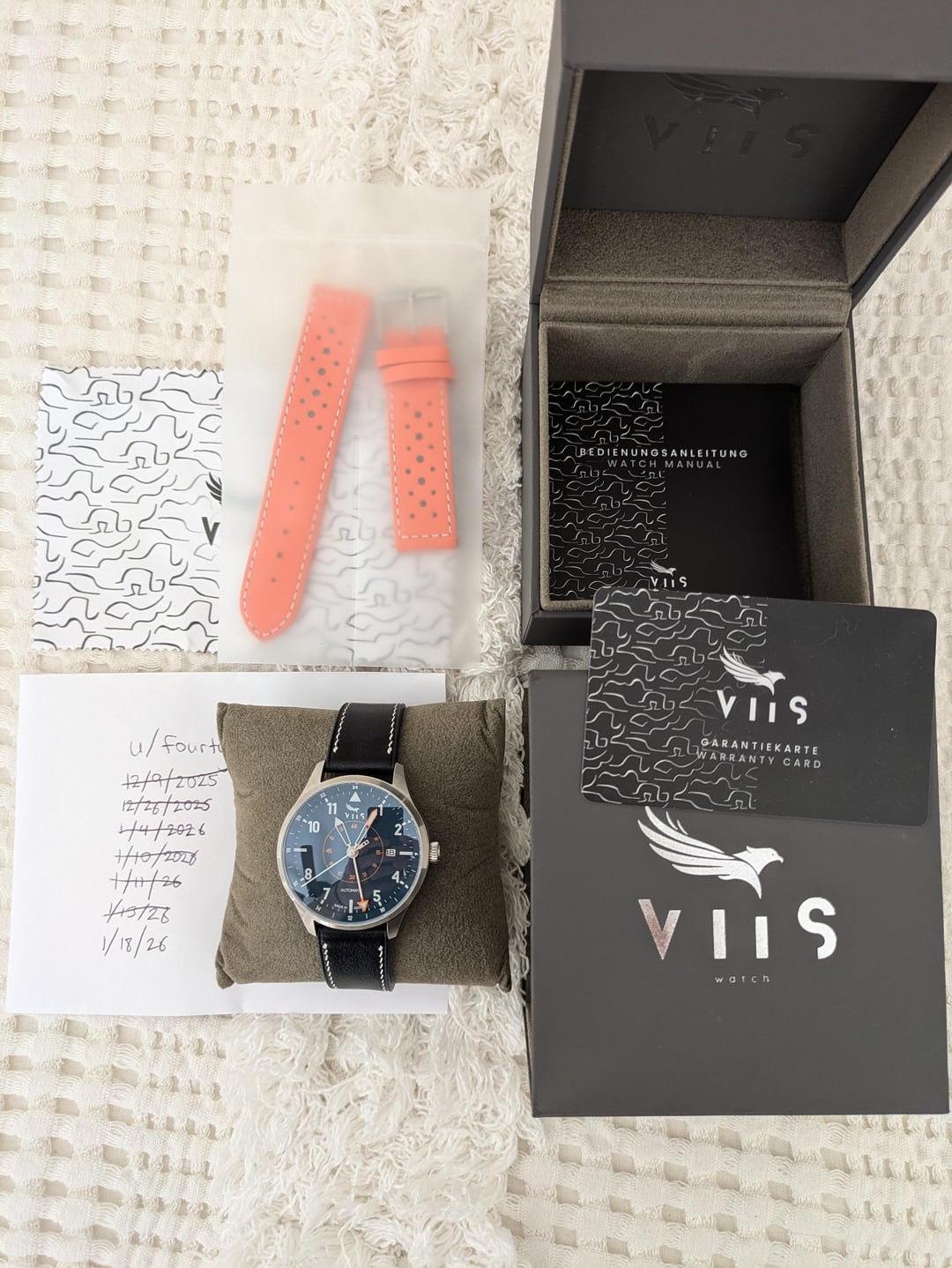 For sale is my Viis Flieger in Adriadic blue. Watch has been worn twice, it's in near-perfect condition. I had my strap maker create this beautiful blue leather strap for it, and it includes the original orange rubber strap which has never been used. This is one of the best value pilots watches from any microbrand. It's extremely nice and keeps great time. My "one in one out" rule is the only reason I'm selling this one. 📜 Includes: Full set - Watch, boxes, warranty card in my name (original owner) 💵 Price: $550 shipped 📍 Location: San Diego 🔒 Authenticity: 100% guaranteed 📦 Domestic Shipping (CONUS) preferred 🌍 International Shipping: Can be negotiated, you pay the cost 💳 Payment: Paypal F&F, Venmo or Face-to-face deal in San Diego I have excellent ratings here on Reddit and can provide additional references at your request. Happy to facetime and show the watch. Please PM me with any questions or additional picture requests. \*\*\*Please check out my other listings!\*\*\* Thanks all!