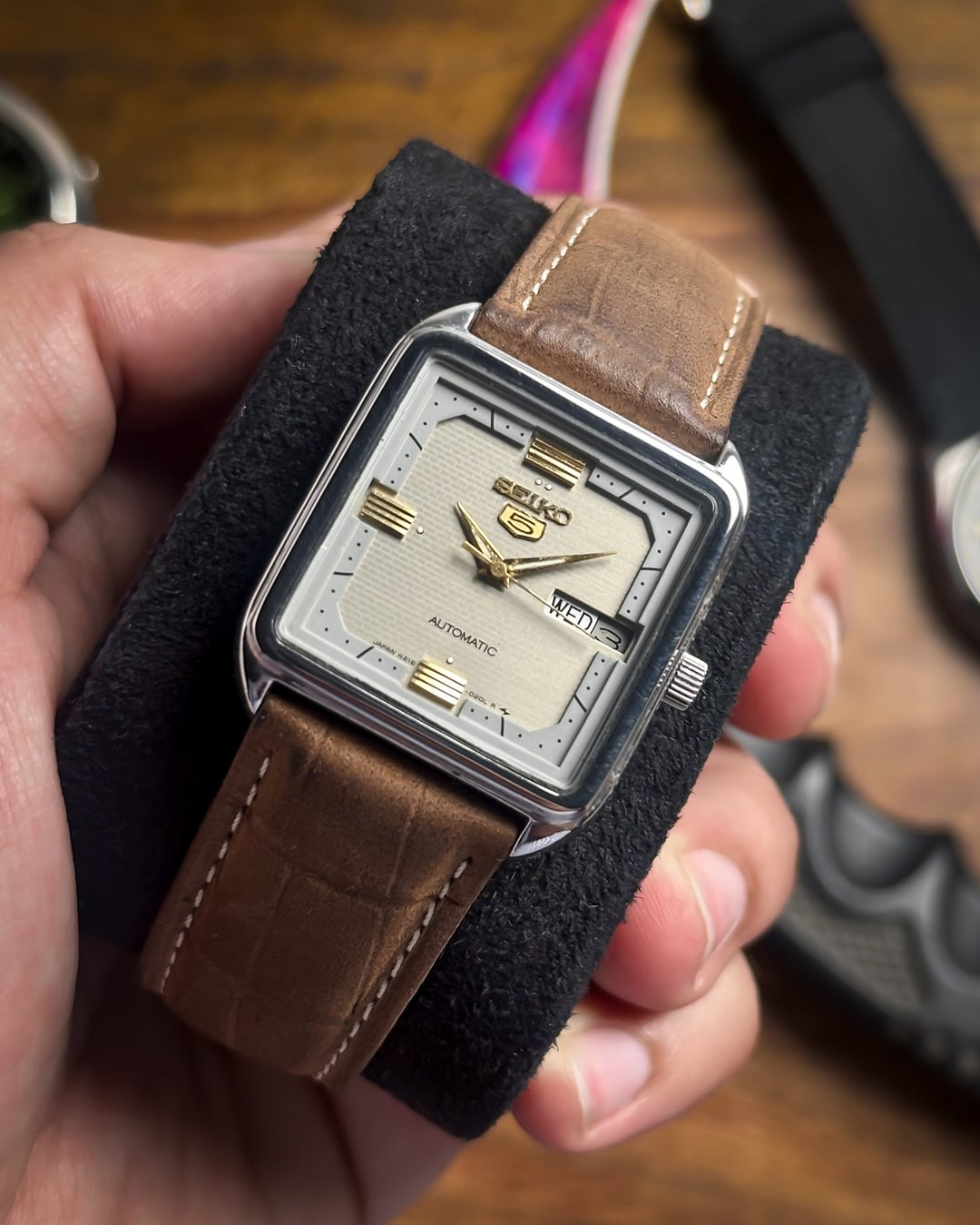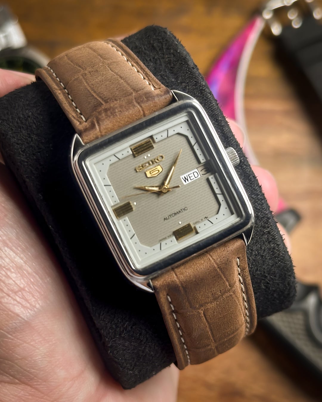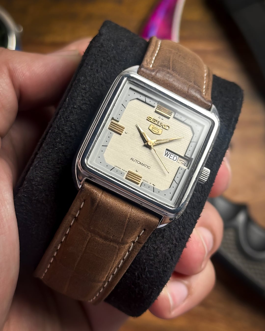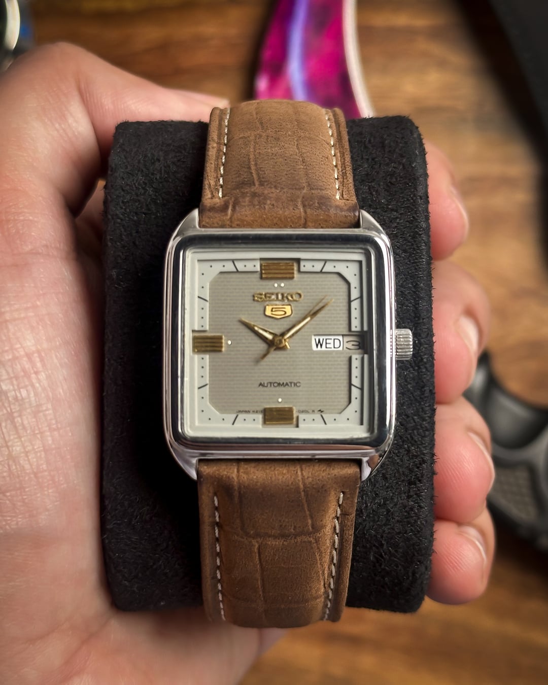 [Timestamp](https://drive.google.com/file/d/1eCOYxu0MB5QcL63di0c6nHEMq75Fh1MQ/view?usp=sharing) Hey Watchexchange! Up for sale is a fascinating piece of Seiko’s design history from **August 1984**. We’ve nicknamed this one **"The Atari Brick"** because its dial pattern and layered geometry perfectly mirror the 8-bit graphics and "Brutalist" tech design of the early 80s gaming era. The dial features a rare **brick pattern** in a sophisticated two-tone light brown and light gray. What truly sets this apart is the **inner octagonal bezel** that creates a massive "3D" depth effect, reminiscent of the isometric levels in retro video games. This gray inner ring houses the minute markers, leaving intentional gaps at 12, 6, and 9 for the **applied gold-tone baton indices**. The **gold-tone dauphine hands** and Seiko 5 logo provide a warm contrast to the architectural, gray-toned dial. The **square TV case** is compact and elegant, featuring a crown at 3 o'clock and a slim profile that disappears under a cuff. Inside beats the **17-Jewel Automatic Caliber 4216A**. This is a highly regarded, compact movement that allows for the watch's impressively slim profile while maintaining the "set-it-and-forget-it" reliability Seiko 5 is known for. I have paired this with a **new high-quality 20mm brown leather strap** that pulls the warm "sandstone" tones right out of the brick dial. **🔹 Key Dimensions** * **Case Diameter:** 32mm (with crown) * **Lug-to-Lug:** 35mm * **Thickness:** 9mm * **Lug Width:** 20mm (Giving it a bold, planted stance on the wrist) 💵 **Price: $175 shipped!** 📦 **Payment: PayPal F&F** or G&S (**+4.5% fee by buyer**) or **bank wire (US banks accepted)** 📩 **DM me for more photos or a custom timestamp.** If you love 80s nostalgia and unique, textured dials that tell a story, **The Atari Brick** is a must-have. Follow my [**Instagram**](https://www.instagram.com/everistwatches/) and **Reddit profile** for more **vintage drops**.