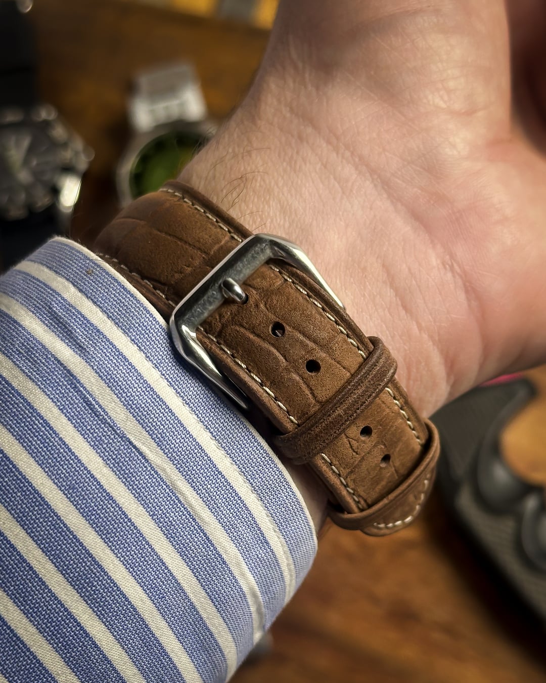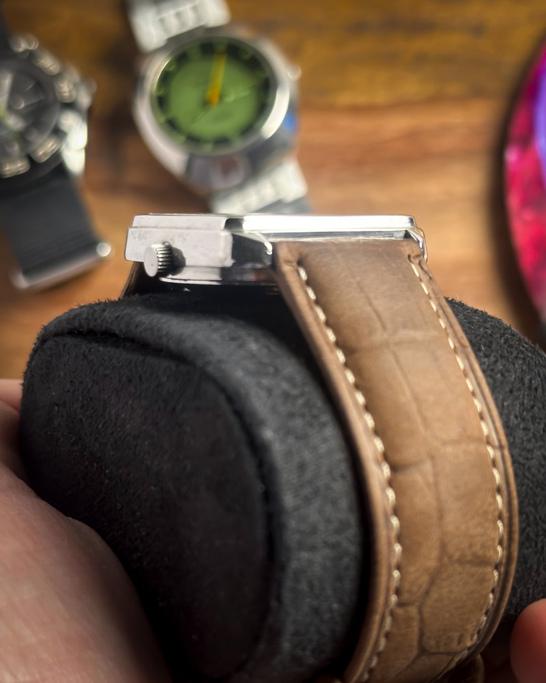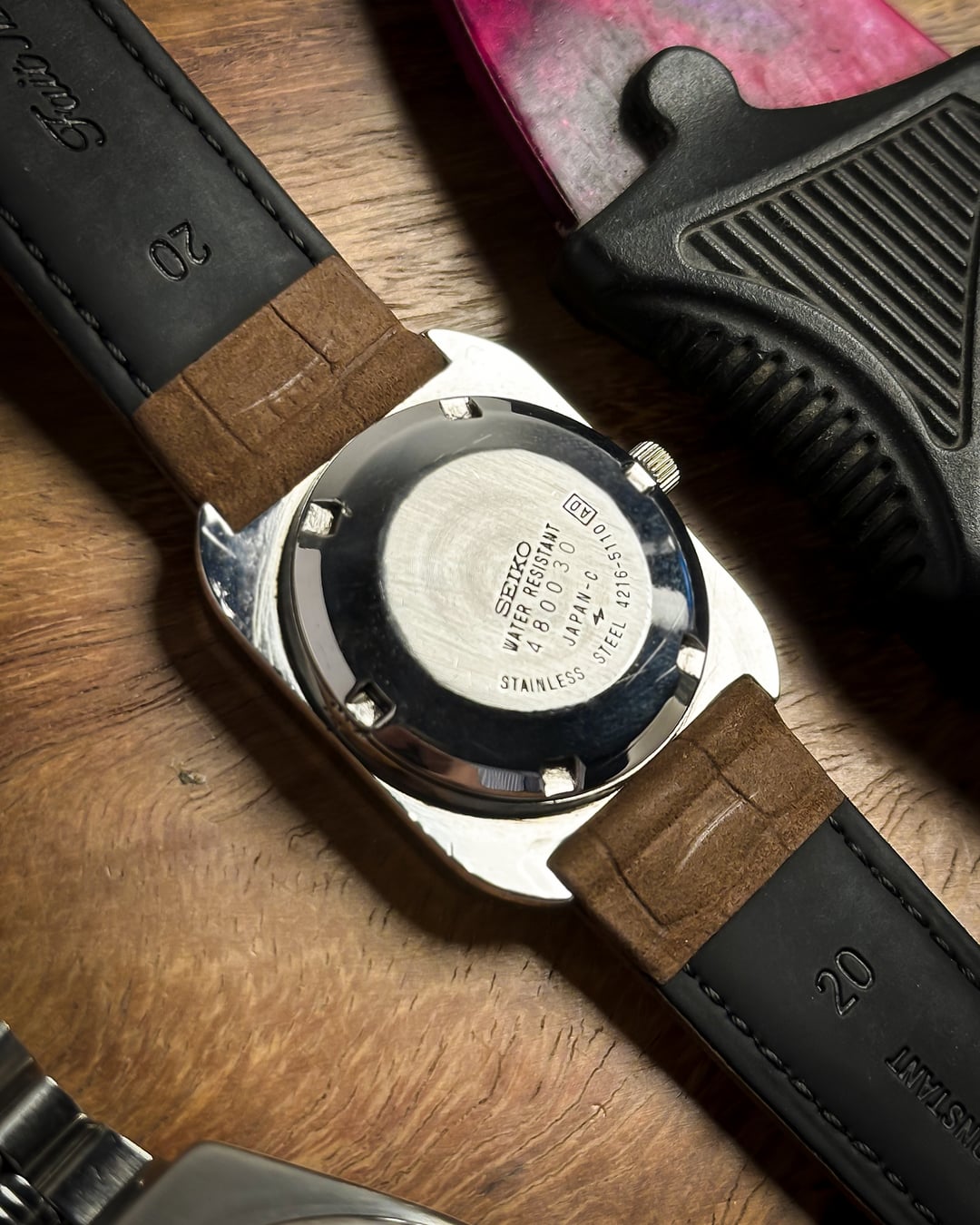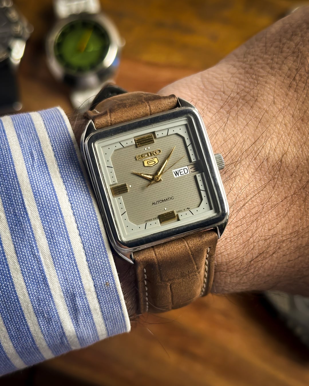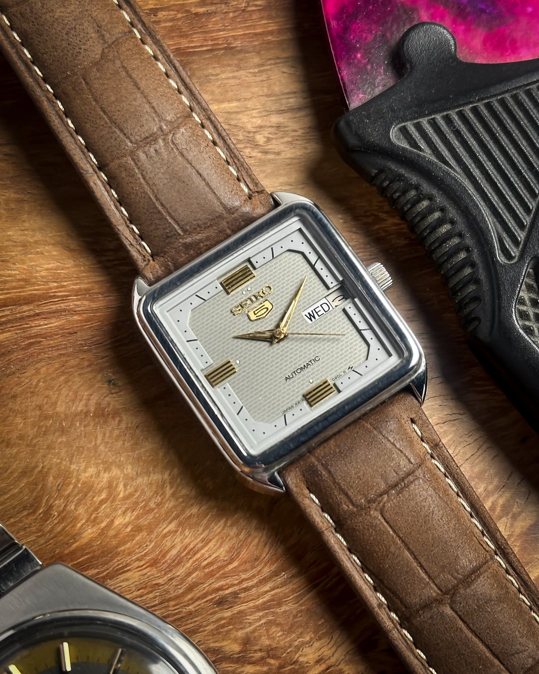 [Timestamp](https://drive.google.com/file/d/1eCOYxu0MB5QcL63di0c6nHEMq75Fh1MQ/view?usp=sharing) Hey Watchexchange! Up for sale is a fascinating piece of Seiko’s design history from **August 1984**. We’ve nicknamed this one **"The Atari Brick"** because its dial pattern and layered geometry perfectly mirror the 8-bit graphics and "Brutalist" tech design of the early 80s gaming era. The dial features a rare **brick pattern** in a sophisticated two-tone light brown and light gray. What truly sets this apart is the **inner octagonal bezel** that creates a massive "3D" depth effect, reminiscent of the isometric levels in retro video games. This gray inner ring houses the minute markers, leaving intentional gaps at 12, 6, and 9 for the **applied gold-tone baton indices**. The **gold-tone dauphine hands** and Seiko 5 logo provide a warm contrast to the architectural, gray-toned dial. The **square TV case** is compact and elegant, featuring a crown at 3 o'clock and a slim profile that disappears under a cuff. Inside beats the **17-Jewel Automatic Caliber 4216A**. This is a highly regarded, compact movement that allows for the watch's impressively slim profile while maintaining the "set-it-and-forget-it" reliability Seiko 5 is known for. I have paired this with a **new high-quality 20mm brown leather strap** that pulls the warm "sandstone" tones right out of the brick dial. **🔹 Key Dimensions** * **Case Diameter:** 32mm (with crown) * **Lug-to-Lug:** 35mm * **Thickness:** 9mm * **Lug Width:** 20mm (Giving it a bold, planted stance on the wrist) 💵 **Price: $175 shipped!** 📦 **Payment: PayPal F&F** or G&S (**+4.5% fee by buyer**) or **bank wire (US banks accepted)** 📩 **DM me for more photos or a custom timestamp.** If you love 80s nostalgia and unique, textured dials that tell a story, **The Atari Brick** is a must-have. Follow my [**Instagram**](https://www.instagram.com/everistwatches/) and **Reddit profile** for more **vintage drops**.