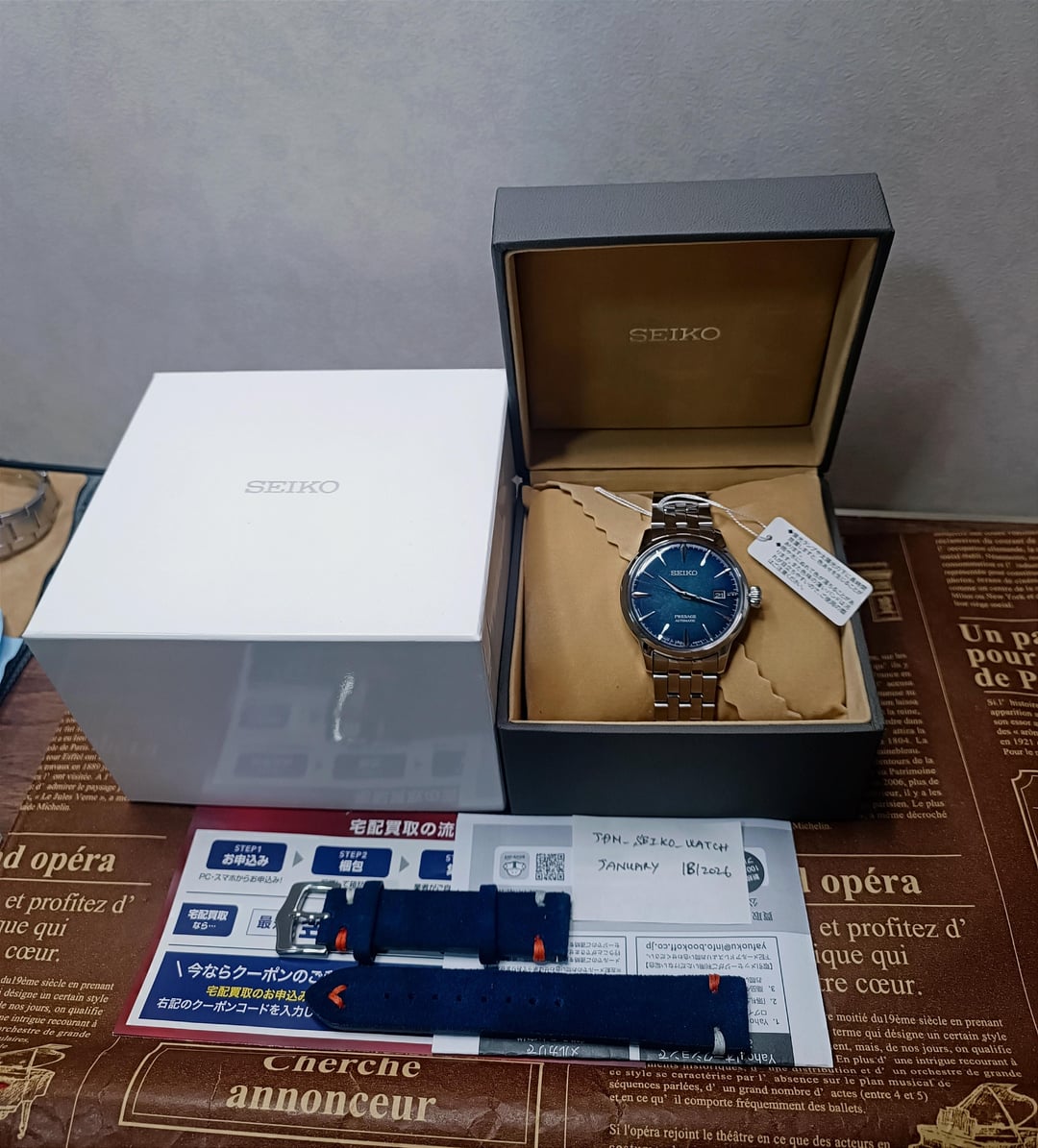 Hello r/WatchExchange, I’m offering my Seiko Presage SARY085 Starlight Cocktail Time Star Bar JDM, a limited edition of only 1,300 pieces, in excellent condition. The watch comes with the original Seiko Cocktail Time stainless steel bracelet and an additional blue suede-style leather strap. This is a highly collectible piece, inspired by the original “Starlight” cocktail created at Star Bar Ginza, a legendary venue closely associated with Seiko and Japanese cocktail culture. Condition Recently fully serviced. Running strong with an accuracy of approximately +10 seconds/day.Overall condition is excellent. Specifications Case diameter: 40mm Lug width: 20mm Movement: Seiko 4R35 automatic, 41-hour power reserve Dial: Starlight Cocktail-inspired dial with signature Cocktail Time texture and shine. Crystal: Curved Hardlex – clean and clear. Original Seiko OEM stainless steel bracelet (Cocktail series). Blue suede leather strap matching the dial. A rare and hard-to-find model, perfect for collectors or elegant daily wear. What’s Included Watch Original Seiko stainless steel bracelet Extra blue suede leather strap Box 📸 Photos / Timestamp: Included in the post! Price, Payment & Shipping Price: $1,080 USD (shipping not included) – no trades Payment: PayPal F&F or G&S (+4.6% fee). Shipping: FedEx Express worldwide (approx. 2–4 days) Cost: $50–$80 USD depending on destination. Feel free to reach out if you have any questions. Thanks for looking!
