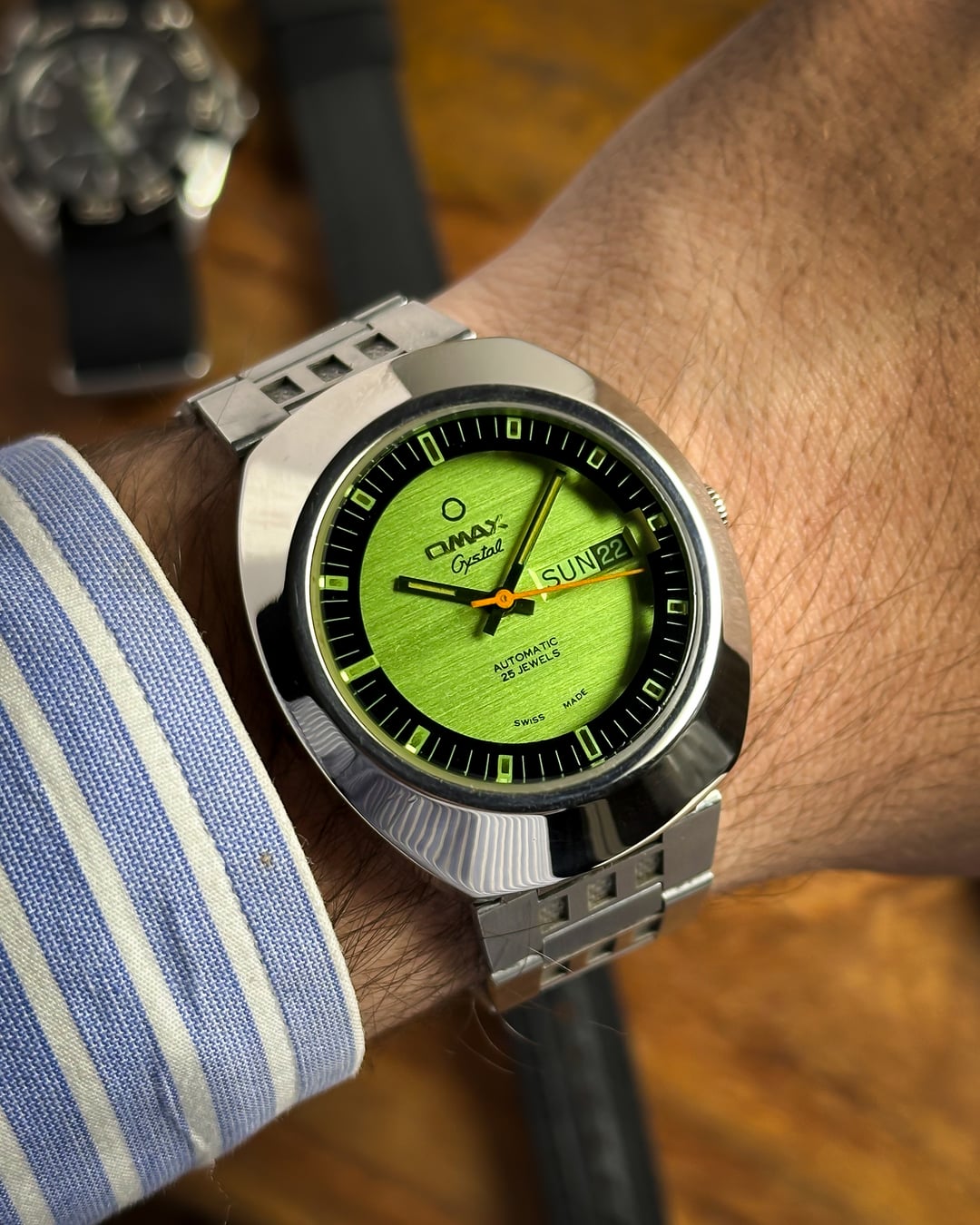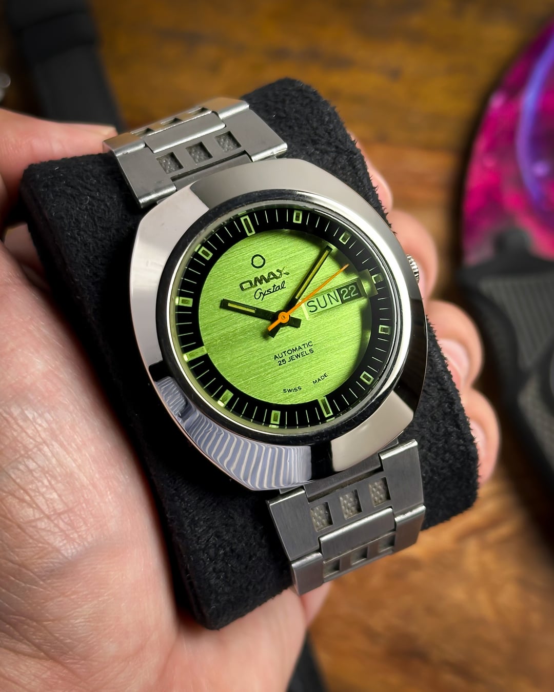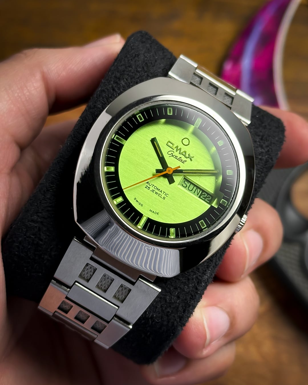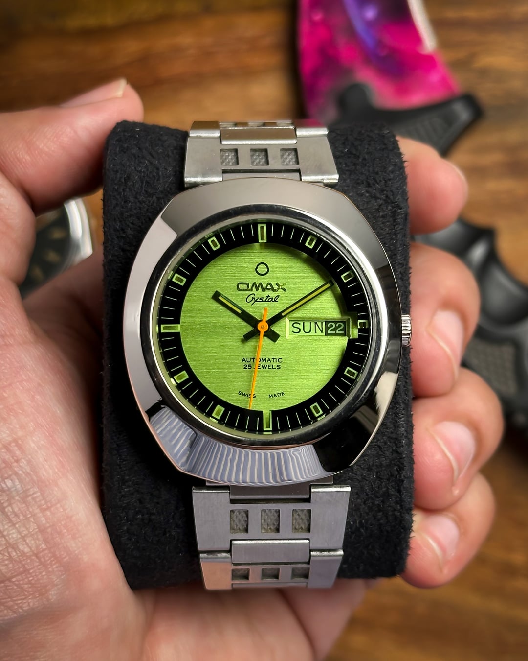 [Timestamp](https://drive.google.com/file/d/1VRMnHw0RHxF6JL8C5SrMnxBYNi49l-Xl/view?usp=sharing) Hey Watchexchange! Up for sale today is a watch that looks like it was pulled straight from an arcade cabinet in 1978: the **Omax Crystal 'Space Invader'**. If you’re a fan of the "Space Age" era of Swiss watchmaking, this is a heavy-duty statement piece. It shares the same bold design language as the famous "Spaceman" series that put Omax on the map for avant-garde collectors. The defining feature is the **Optical Green Crystal**. While the dial beneath it is actually white with a subtle, horizontal "brushed" texture, the heavily tinted green crystal transforms the entire face into a glowing, vibrant emerald. This creates a deep "floating" effect, as the **indices and minute markers** are actually printed on the underside of the crystal itself—resembling a retro radar or sonar display. To complete the mission-ready look, it features sharp **black baton hands** and a **vivid orange sweeping seconds hand** for a high-contrast pop—ensuring legibility even in the deepest corners of the galaxy. The case is a **robust, armored UFO-style** design. Made of chrome-plated base metal, it has a thick, high-polish presence that feels industrial and indestructible. It comes on its **original stainless steel bracelet**, featuring textured center links that perfectly match the "armored" aesthetic of the head. *🔹* ***Key Dimensions*** * **Case Diameter:** 38mm (without crown) * **Lug-to-Lug:** 42mm * **Thickness:** 10.5mm * **Lug Width:** 18mm ***🕰️ A Bit of History*** Omax was founded in 1946 in Geneva, Switzerland, and by the 1970s, they became world-renowned for their collaboration with designer **André Le Marquand**, who created the famous "Spaceman" series. This "Crystal" model is a direct descendant of that design language—built for an era that was obsessed with the future, space travel, and bold geometry. 💵 **Price: $175 shipped!** 📦 **Payment: PayPal F&F** or G&S (**+4.5% fee by buyer**) or **bank wire (US banks accepted)** 📩 **DM me for more photos or a custom timestamp.** This is a rare chance to own a piece of Swiss "Space Age" history that still looks futuristic 50 years later. Follow my [**Instagram**](https://www.instagram.com/everistwatches/) and **Reddit profile** for more **vintage drops**.