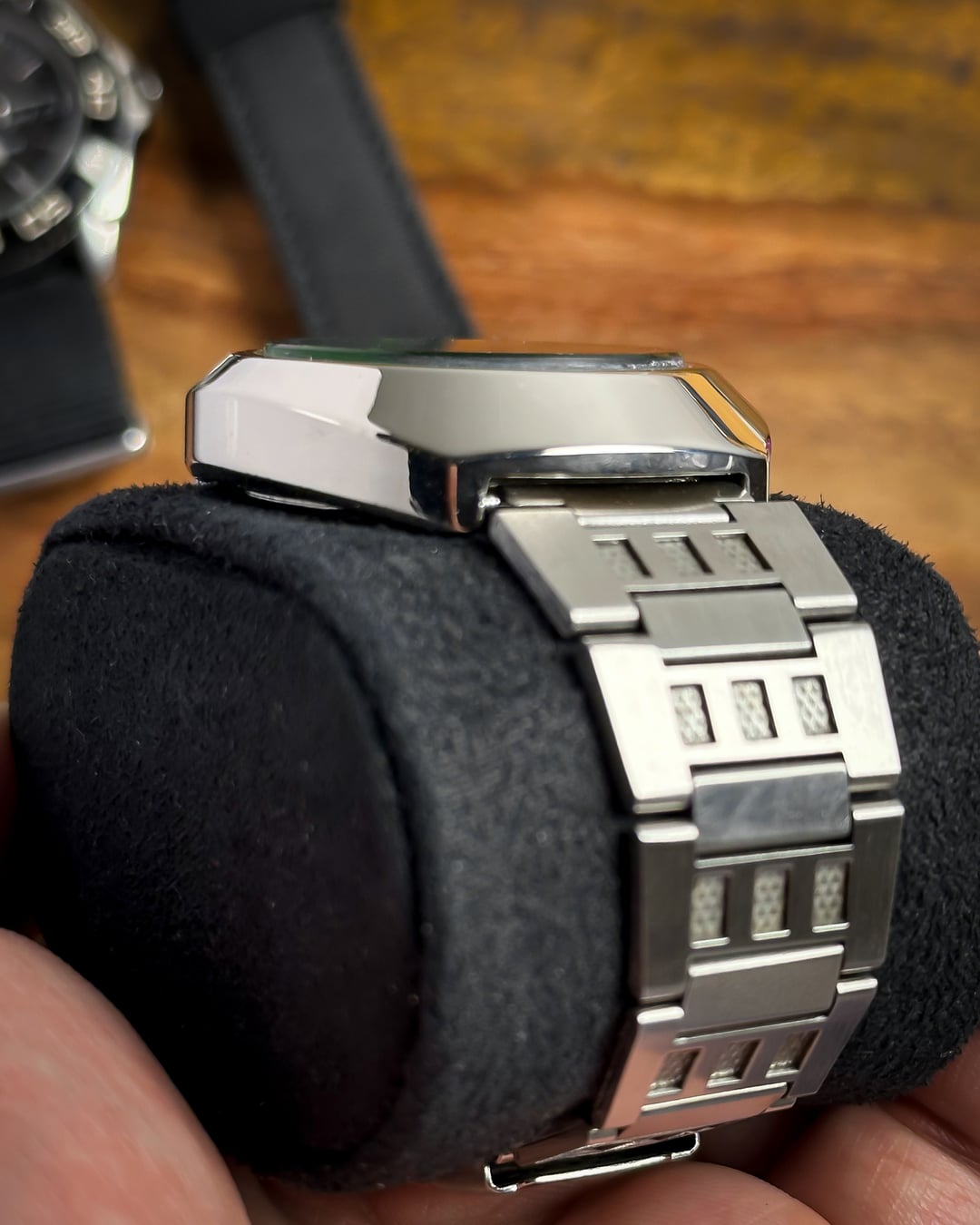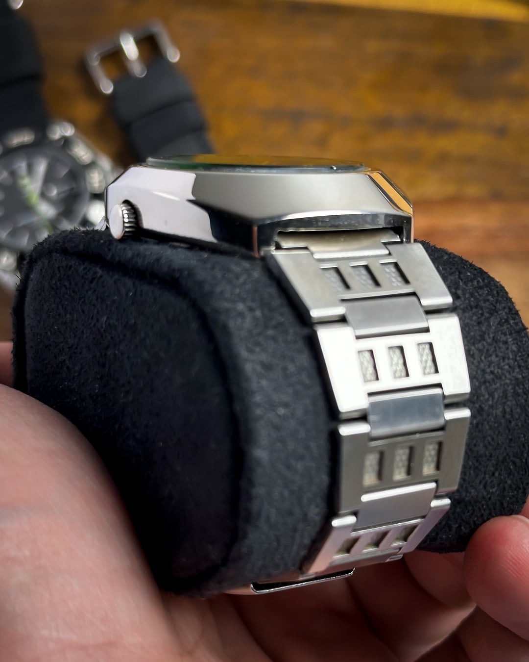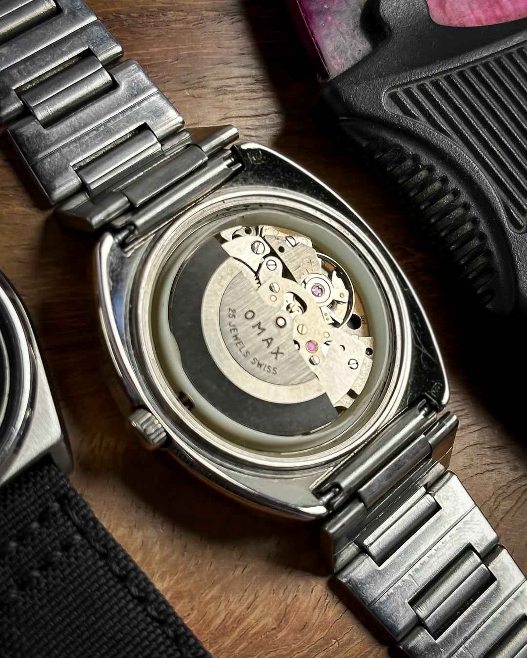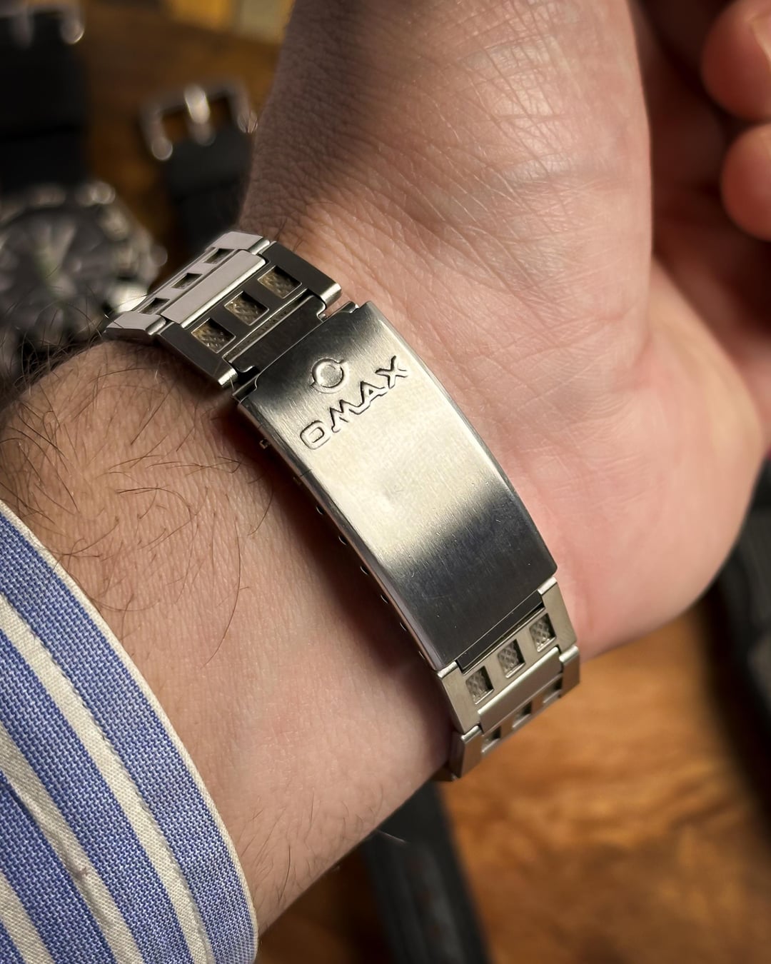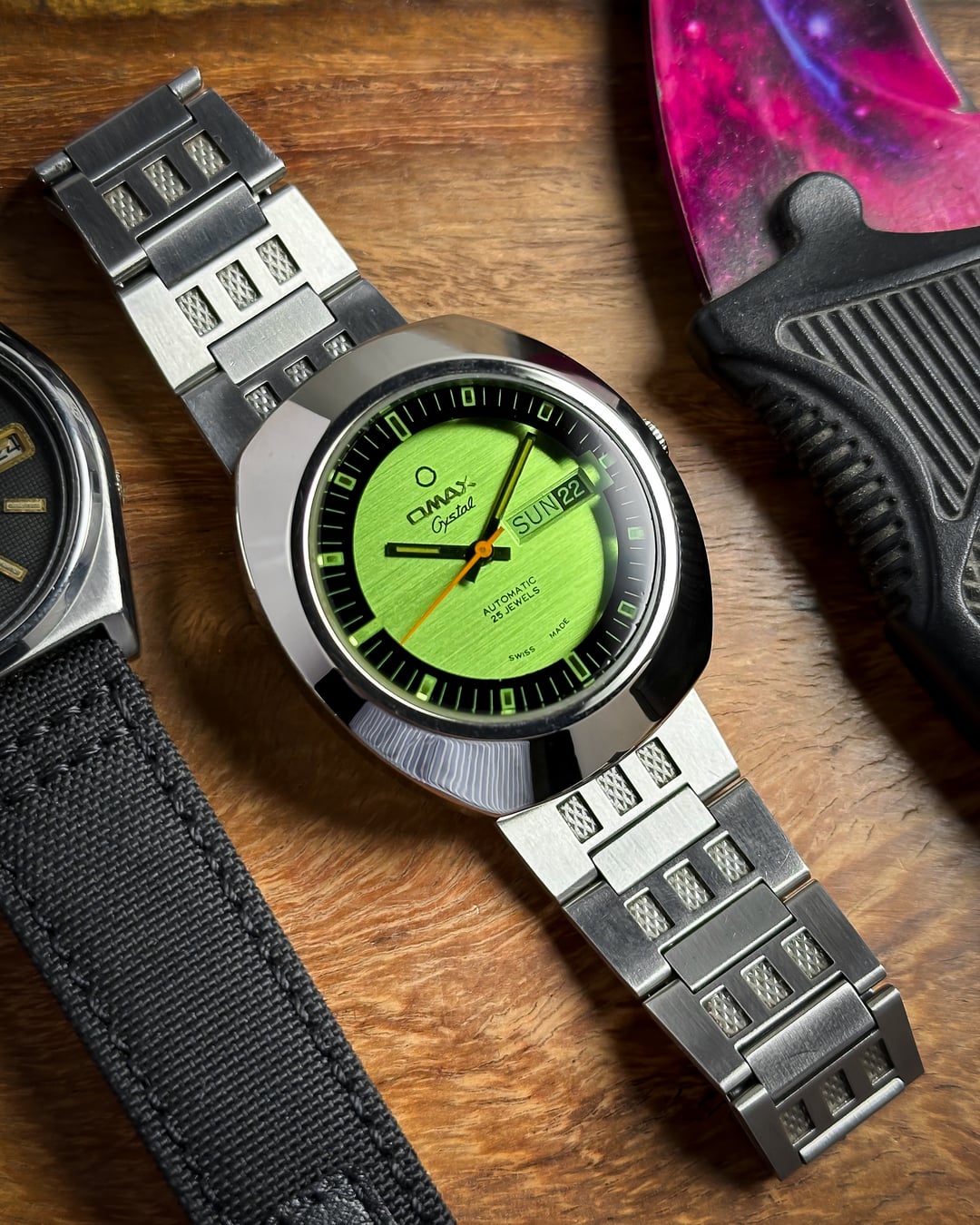 [Timestamp](https://drive.google.com/file/d/1VRMnHw0RHxF6JL8C5SrMnxBYNi49l-Xl/view?usp=sharing) Hey Watchexchange! Up for sale today is a watch that looks like it was pulled straight from an arcade cabinet in 1978: the **Omax Crystal 'Space Invader'**. If you’re a fan of the "Space Age" era of Swiss watchmaking, this is a heavy-duty statement piece. It shares the same bold design language as the famous "Spaceman" series that put Omax on the map for avant-garde collectors. The defining feature is the **Optical Green Crystal**. While the dial beneath it is actually white with a subtle, horizontal "brushed" texture, the heavily tinted green crystal transforms the entire face into a glowing, vibrant emerald. This creates a deep "floating" effect, as the **indices and minute markers** are actually printed on the underside of the crystal itself—resembling a retro radar or sonar display. To complete the mission-ready look, it features sharp **black baton hands** and a **vivid orange sweeping seconds hand** for a high-contrast pop—ensuring legibility even in the deepest corners of the galaxy. The case is a **robust, armored UFO-style** design. Made of chrome-plated base metal, it has a thick, high-polish presence that feels industrial and indestructible. It comes on its **original stainless steel bracelet**, featuring textured center links that perfectly match the "armored" aesthetic of the head. *🔹* ***Key Dimensions*** * **Case Diameter:** 38mm (without crown) * **Lug-to-Lug:** 42mm * **Thickness:** 10.5mm * **Lug Width:** 18mm ***🕰️ A Bit of History*** Omax was founded in 1946 in Geneva, Switzerland, and by the 1970s, they became world-renowned for their collaboration with designer **André Le Marquand**, who created the famous "Spaceman" series. This "Crystal" model is a direct descendant of that design language—built for an era that was obsessed with the future, space travel, and bold geometry. 💵 **Price: $175 shipped!** 📦 **Payment: PayPal F&F** or G&S (**+4.5% fee by buyer**) or **bank wire (US banks accepted)** 📩 **DM me for more photos or a custom timestamp.** This is a rare chance to own a piece of Swiss "Space Age" history that still looks futuristic 50 years later. Follow my [**Instagram**](https://www.instagram.com/everistwatches/) and **Reddit profile** for more **vintage drops**.