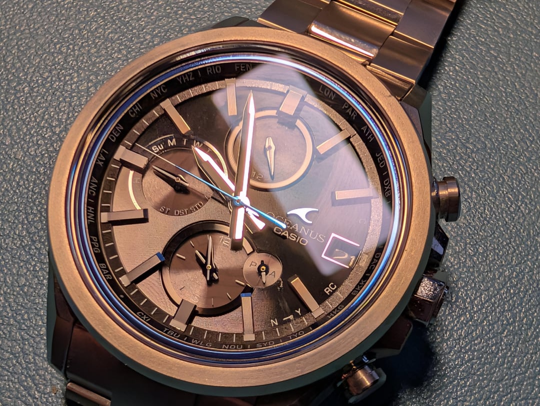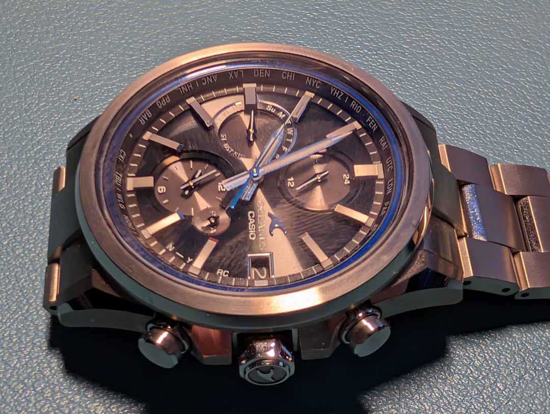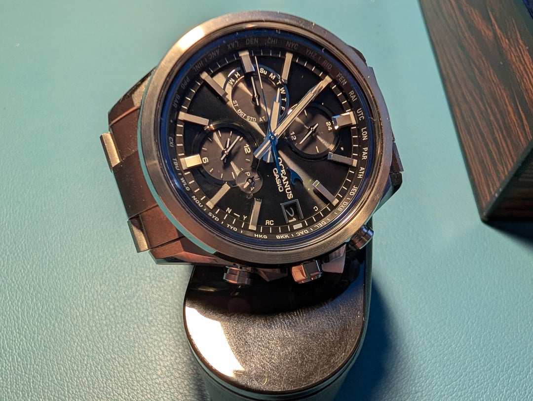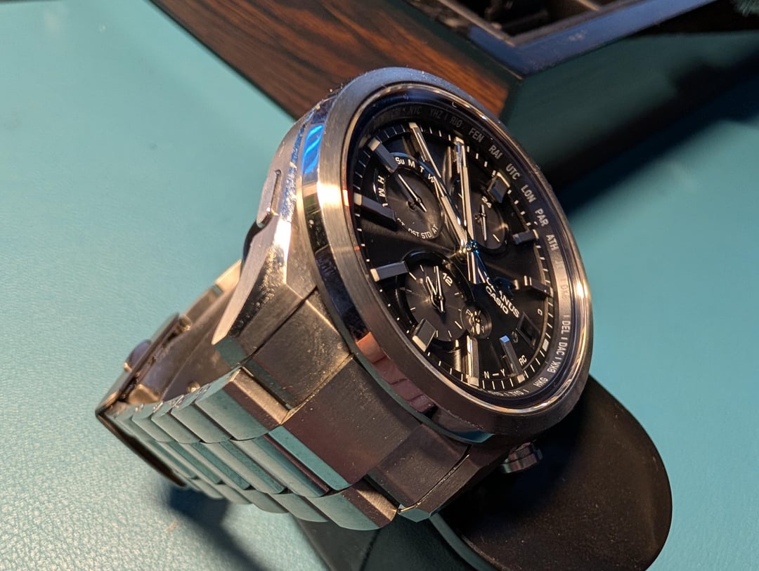 Hello Casio Fans, Up for sale is my **Oceanus OCW-T4000**. It comes complete with the original box and papers. I’ve owned this for nearly two years, but it rarely gets any wrist time, so I’m making room for new additions. It’s an incredibly comfortable and lightweight titanium piece. **Condition & Technical Notes:** * **Bezel:** Great physical condition with one exception—there is a faint scuff at the 1 o'clock position (please see photos). * **Caseback:** I attempted to open the caseback to swap the battery myself and was unsuccessful. In the process, the caseback did sustain some scratching (see photos). * **Battery/Function:** Because I don't wear it often, the charge level occasionally drops. When low, the sub-dials may jitter or misalign. However, after a day of light exposure to charge the Tough Solar cell and an rsync with the phone app, everything functions perfectly as it should. According to my research the jittery hands are sign of battery saver function. **Price:** $350 *Price reflects the caseback scratches and the need for a new battery.* *Watch is sold as is no returns.* **Payment:** PayPal F&F, Venmo, or Zelle. **Shipping:** \[Insert your shipping preference here, e.g., CONUS included\].