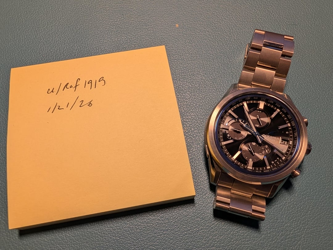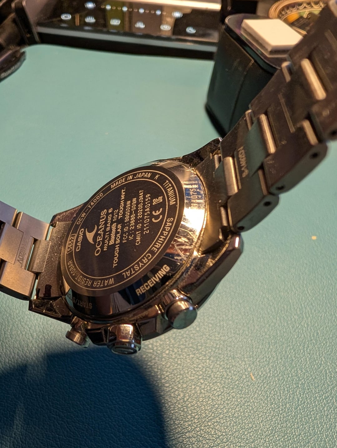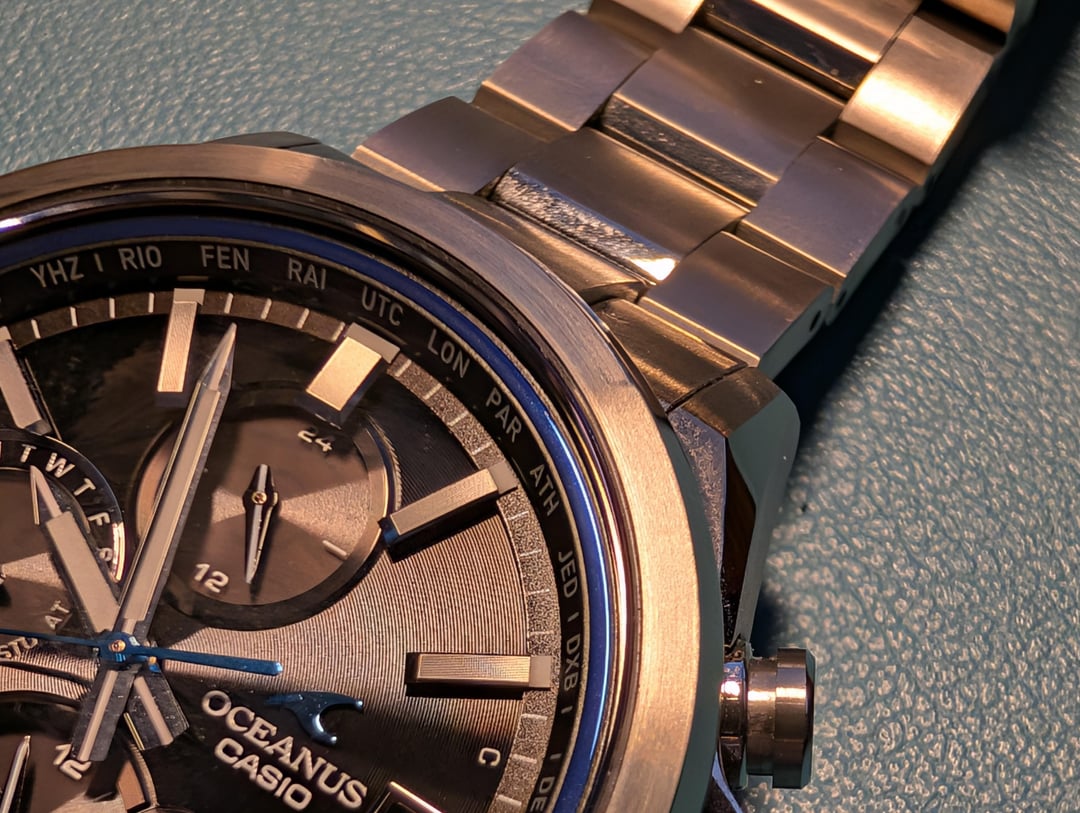 Hello Casio Fans, Up for sale is my **Oceanus OCW-T4000**. It comes complete with the original box and papers. I’ve owned this for nearly two years, but it rarely gets any wrist time, so I’m making room for new additions. It’s an incredibly comfortable and lightweight titanium piece. **Condition & Technical Notes:** * **Bezel:** Great physical condition with one exception—there is a faint scuff at the 1 o'clock position (please see photos). * **Caseback:** I attempted to open the caseback to swap the battery myself and was unsuccessful. In the process, the caseback did sustain some scratching (see photos). * **Battery/Function:** Because I don't wear it often, the charge level occasionally drops. When low, the sub-dials may jitter or misalign. However, after a day of light exposure to charge the Tough Solar cell and an rsync with the phone app, everything functions perfectly as it should. According to my research the jittery hands are sign of battery saver function. **Price:** $350 *Price reflects the caseback scratches and the need for a new battery.* *Watch is sold as is no returns.* **Payment:** PayPal F&F, Venmo, or Zelle. **Shipping:** \[Insert your shipping preference here, e.g., CONUS included\].