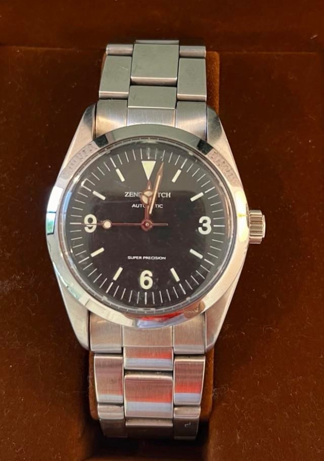 Up for sale...ZENO WATCH BASEL AUTOMATIC MEN'S WRIST WATCH BLACK DIAL ZN-001 SWISS VINTAGE **$375 Shipped** **Discontinued Zeno “Explorer” homage with the coveted 36mm, 1016-era proportions and clean 3-6-9 dial. These have a real cult following because they nailed the vintage Explorer feel—and because collector lore says the design was a little too close and Zeno ultimately moved away from it rather than go toe-to-toe with Rolex pressure/legal action (often discussed online).** [**https://imgur.com/a/dm3mvoj**](https://imgur.com/a/dm3mvoj) Full set - Box and Papers Runs well - Miyota movement Sized for 7" wrist, includes two extra links (all original to bracelet/watch) Watch is in very good condition for age / vintage. Please note it has some very minor wear/tear associated from being worn - “desk diver” marks, if you will including: \-clasp on watch show light scratching \-very small (almost imperceptible) ding at 8:30 on bezel \-2-3 small dings at 3:30 on bezel from knocking a hard object…by themselves the dings are almost imperceptible, but are visible because they’re clustered together. In all, the dings are minor and do not impact the quality, Beaty, or value of this watch. They’re also in line with a vintage/used watch knowing the watch has been worn but well loved and taken care of! Please message me with any question about quality or condition of the watch - happy to send more images if the interest is there.