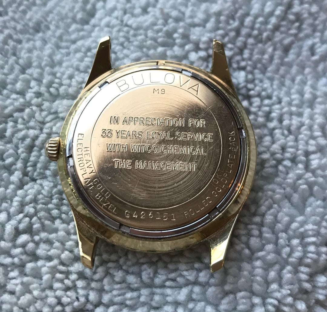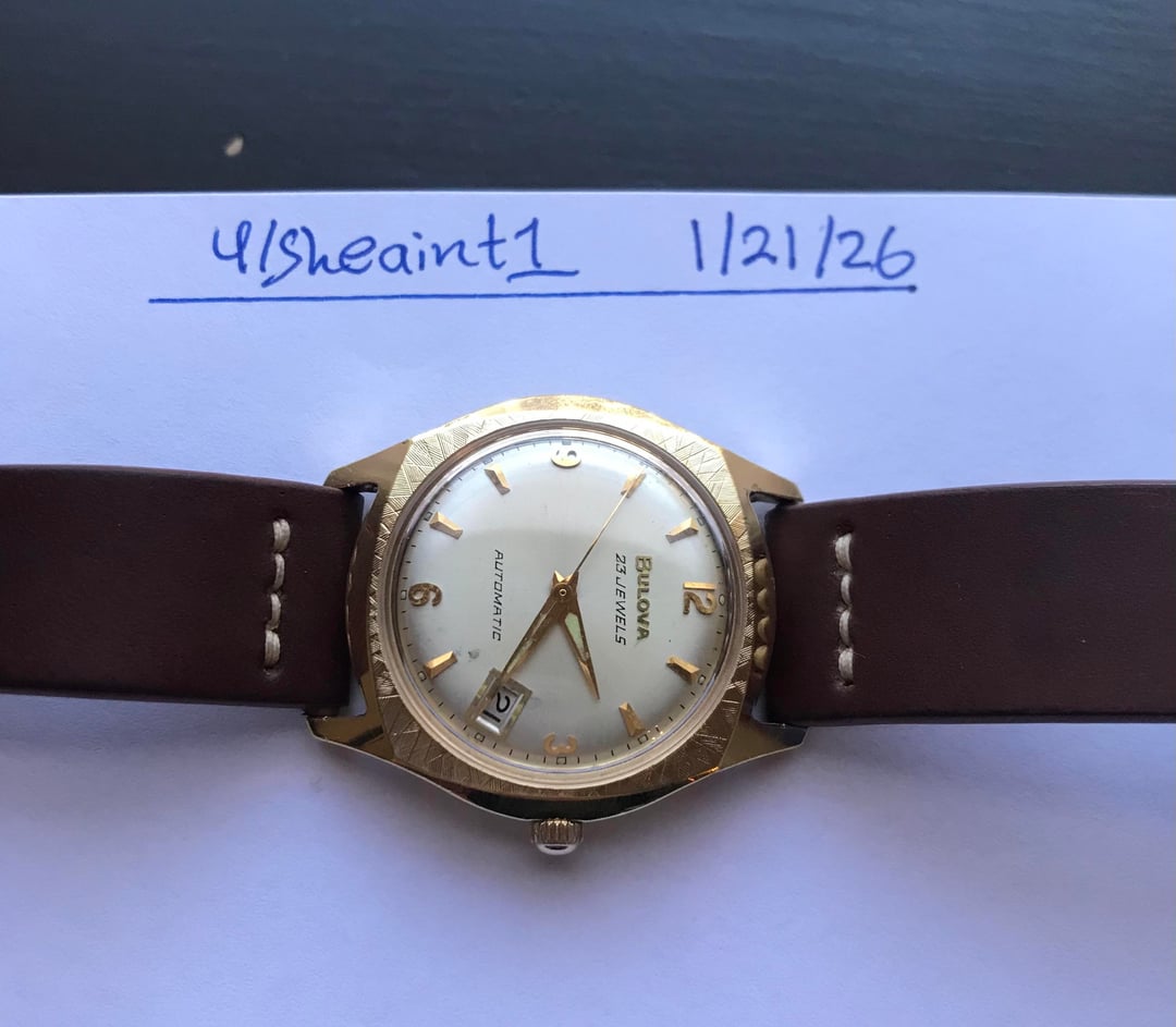 Greetings [r/Watchexchange](https://www.reddit.com/r/Watchexchange/) * 💵 PayPal FF & Zelle (Preferred) * Ships within 24 hours of purchase USPS/UPS Insured (US Only) International Available at an additional cost based on location. **Today I have a Bulova M9.** It’s quite a lovely timepiece and has been fully serviced. The Art Deco design is a personal favorite of mine, and the 33mm case size makes it a rather comfortable wear on the wrist. It’s an elegant piece with some history attached—there’s an inscription on the case back commemorating 33 years of service at the Witco Chemical Company (defunct as of 1999). Overall, it's a great piece that would make many a horology enthusiast quite happy. **Condition:** New Crystal with honest wear around the case. A 10KT Rolled Goldplate Back with a Heavy Gold electroplate Bezel. The dial has two small marks above the five and date window (the pictures will better depict this). Fully serviced and keeping time well. **Bulova Sea King** * Movement: Bulova in house 10CPACD 23 Jewels * Case Width: 33mm (excluding crown & 35mm (Crown) * Lug to Lug: 38.5mm * Thickness: 10.5mm * Width between the Lugs: 17mm * Crystal: New (replaced) * Case: Signs of normal use given age (Pictures & Video will better depict this) * Dial: Some minor spots with a more noticeable appearance just above the 5 marker on the dial. Dial hands show slight aging but no corrosion. * No Box 📦 Or papers 📄 * Full Grain Leather Strap (Not original) * serviced in July 2025 and crystal replacement. * Asking $153 Thank you for your time.
