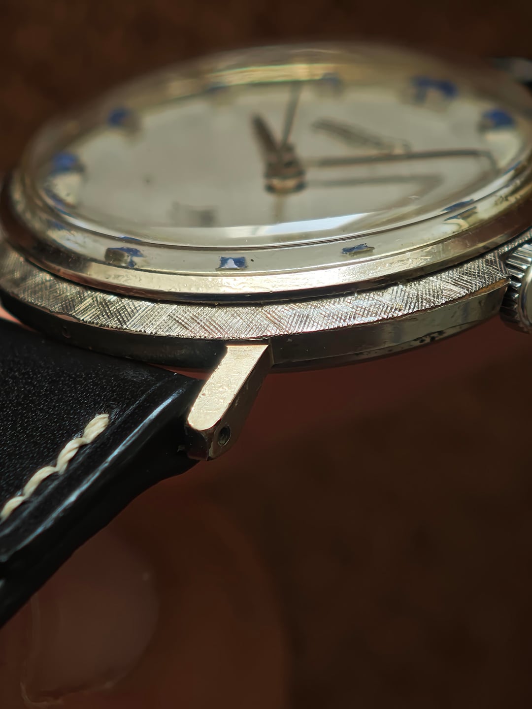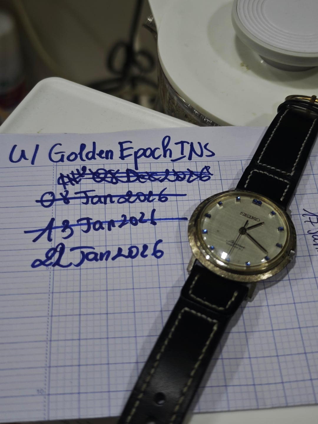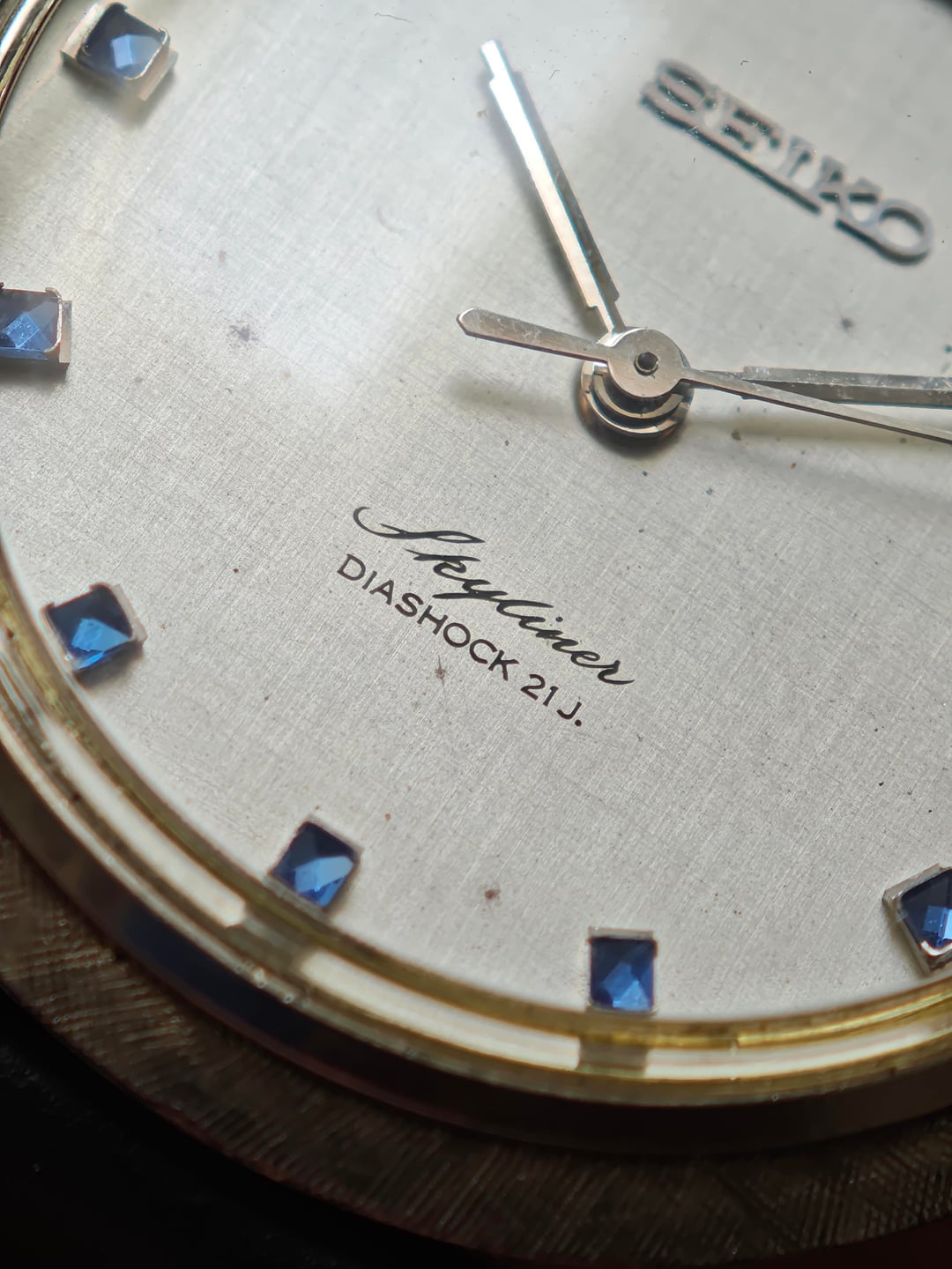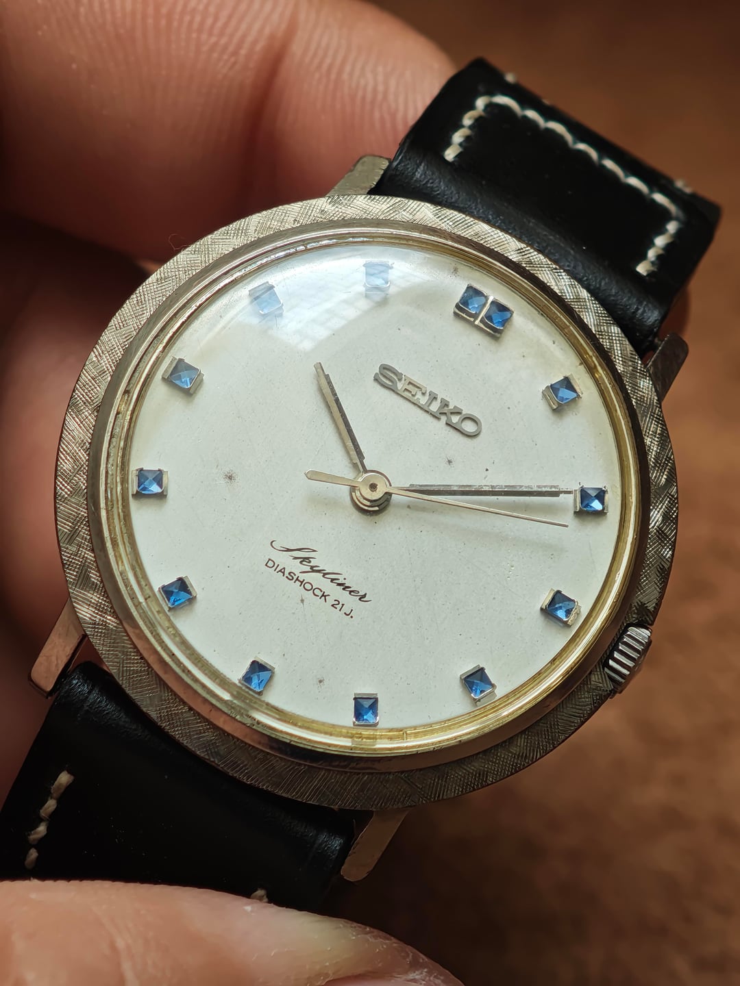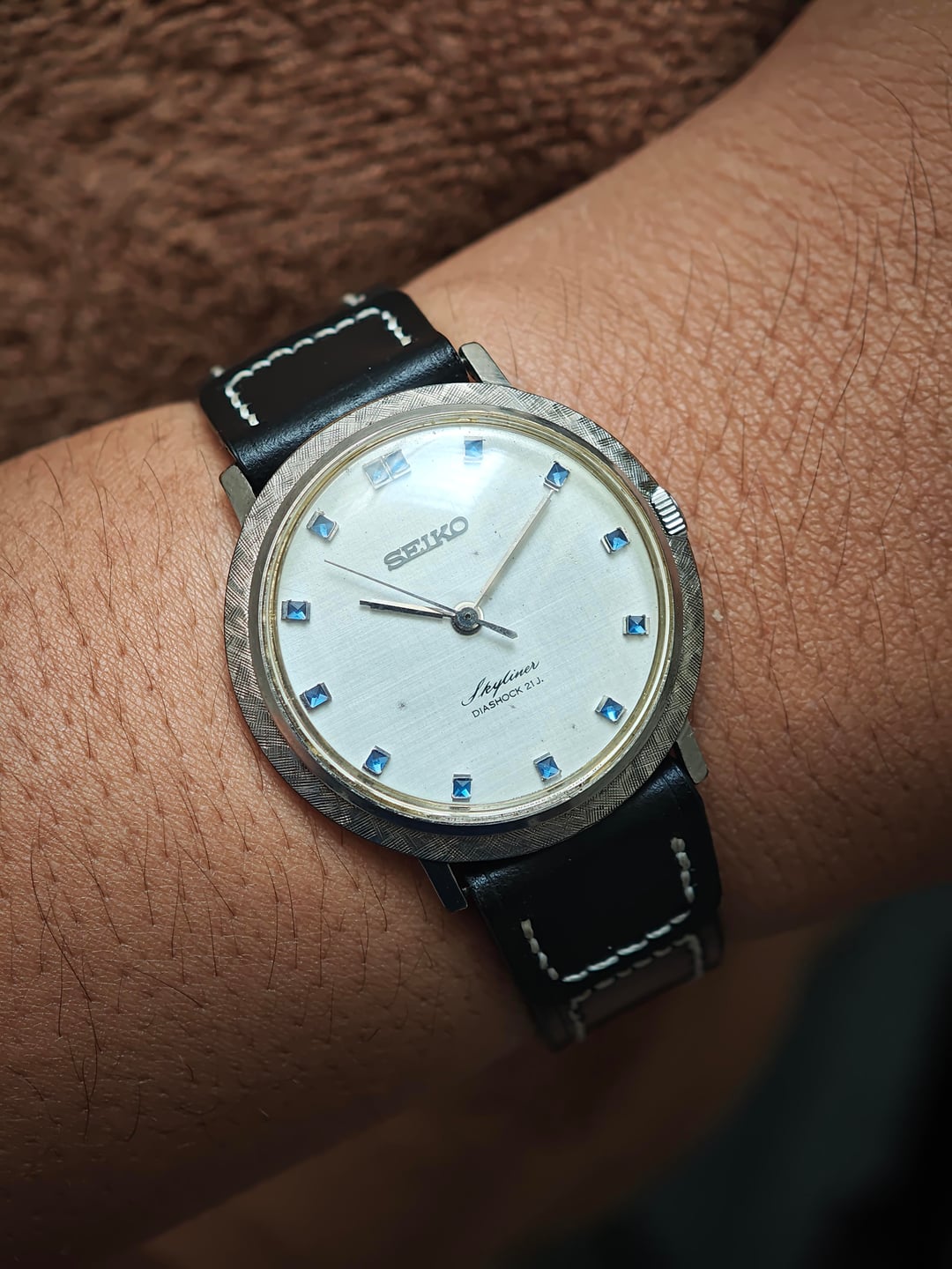 This is one of those Skyliners that collectors actively look for and rarely see offered. The 6220-7120 Bluestones sits in a very small niche of early Seiko dress watches—low production, premium finishing, and details that didn’t last long in Seiko’s lineup. The standout here is the PDP (palladium) plated case with a factory textured pattern. This was a higher-grade finish used briefly before stainless steel became standard, and examples that still retain sharp texture like this are increasingly hard to find. Add the original bluestone hour markers, and you have a configuration that separates this from standard Skyliners immediately. Details: Brand: Seiko Model: Skyliner Reference: 6220-7120 Dial: Silver, bluestone markers, slight patina Case: PDP plated with rare textured pattern Movement: Manual wind, serviced Strap: Leather strap (as pictured) Price: 370 USD shipped (Tax duty included) Payment: PayPal F2F PayPal G&S (buyer adds fees)