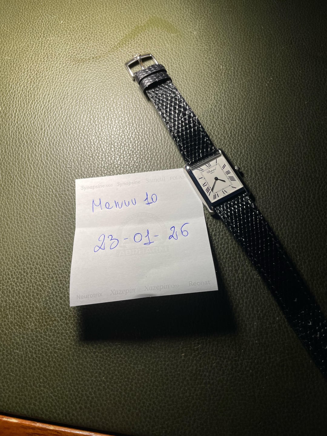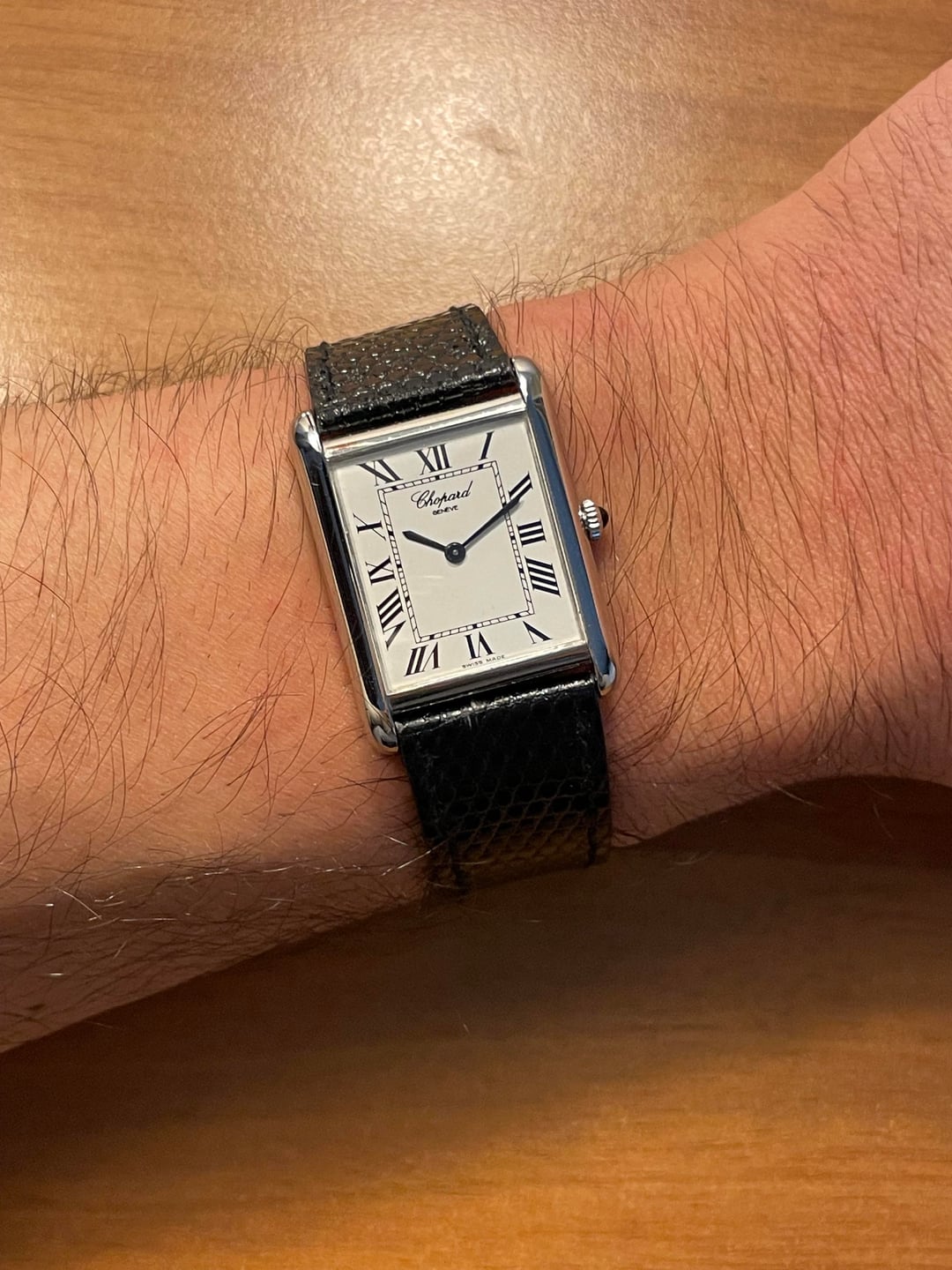 Thank you for your comment, u/Manuu10. Your description has been copied below. Beautiful Chopard Tank with steel case and Roman numeral dial. Brand: Chopard Model: Tank Reference: 8014-1 Case: 25x33mm excluding crown Case Material: Stainless Steel Year: about 1990 Caliber: Manual winding 895 derived from JLC (Le Coultre) Serviced in July 2025. Perfectly functional and accurate Strap: new (generic) lizard with original Chopard buckle. Set: Watch ONLY, No box No documents The watch is in excellent aesthetic condition. To be fair I point out a MICROSCOPIC sign (dot) on the glass visible in the last photo, the dial is in excellent condition. €1500 + shipping (price is not negotiable) Located in Italy