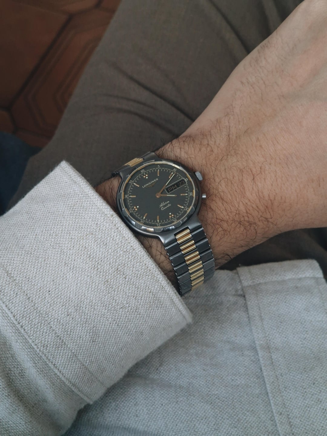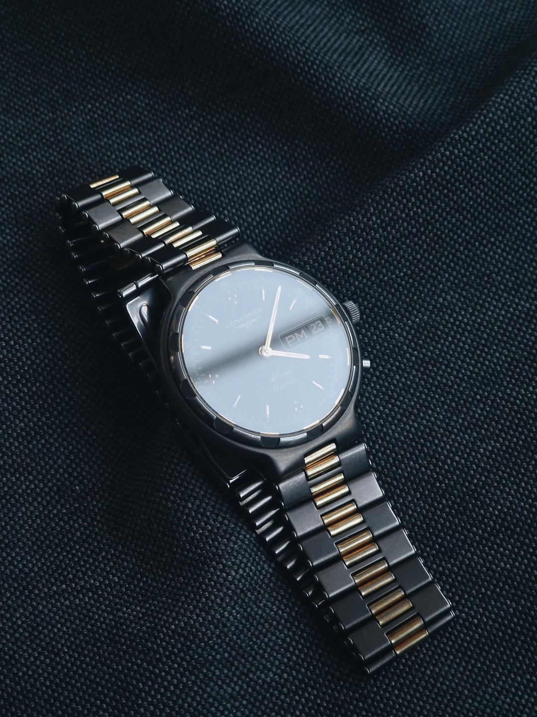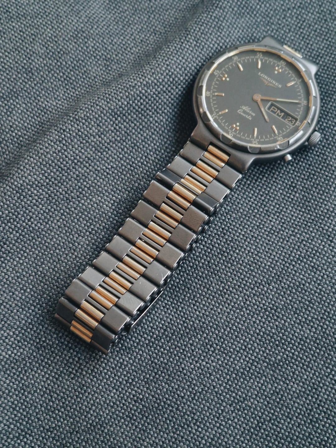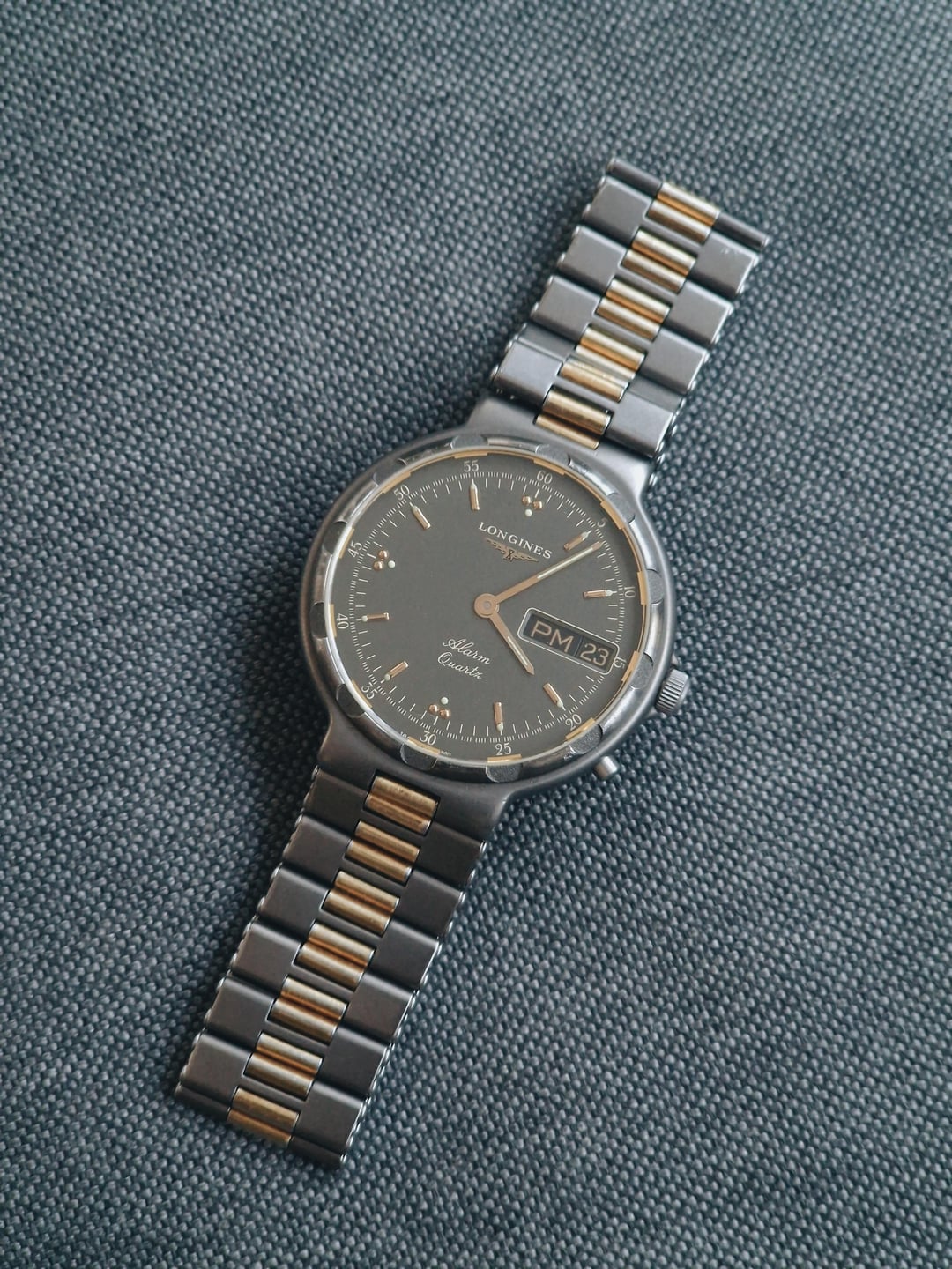 A very cool piece from the era when Longines was experimenting heavily with technology. This Conquest Alarm features a titanium case with gold-plated accents, nailing that late 80s two-tone look while feeling extremely light on the wrist. The alarm function is incredibly practical – loud enough to be useful and far more interesting and rare than the usual complications, although a bit tricky to set. A quirky piece that shows Longines wasn’t as serious as it is nowadays. **Condition:** Good for its age. The titanium case has minor usage marks, but the bracelet shows some wear. The dial looks impressive, without any markings or patina. Please see the pictures for a better description. **Case Size:** 33.2 x 37.1mm titanium case with a thickness of 7.6mm. **Movement:** ETA 957.011, quartz with alarm and date. The date window also shows if the alarm is set to AM, PM, or OFF. It was recently cleaned and a new battery was fitted, so it’s ready to be worn. To set the time/alarm, you pull the crown completely out, turn and hold the crown. It’s pretty straightforward once you get the hang of it. **Price:** Asking $350. Please add $25 for worldwide shipping. Payment methods include Wise, ACH transfer, Revolut, Bitcoin (On-Chain or Lightning), or PayPal G&S for buyers with solid references. Add +7.5% for currency conversion fees on the latter. Portugal has suspended all local post shipments to the US, but I can still ship with UPS ($100). Established seller with over 220 transactions – buy with confidence! Make sure to follow me on Instagram (@daily.worn) to check out the newest additions. [Timestamp](https://imgur.com/a/P201P9z)