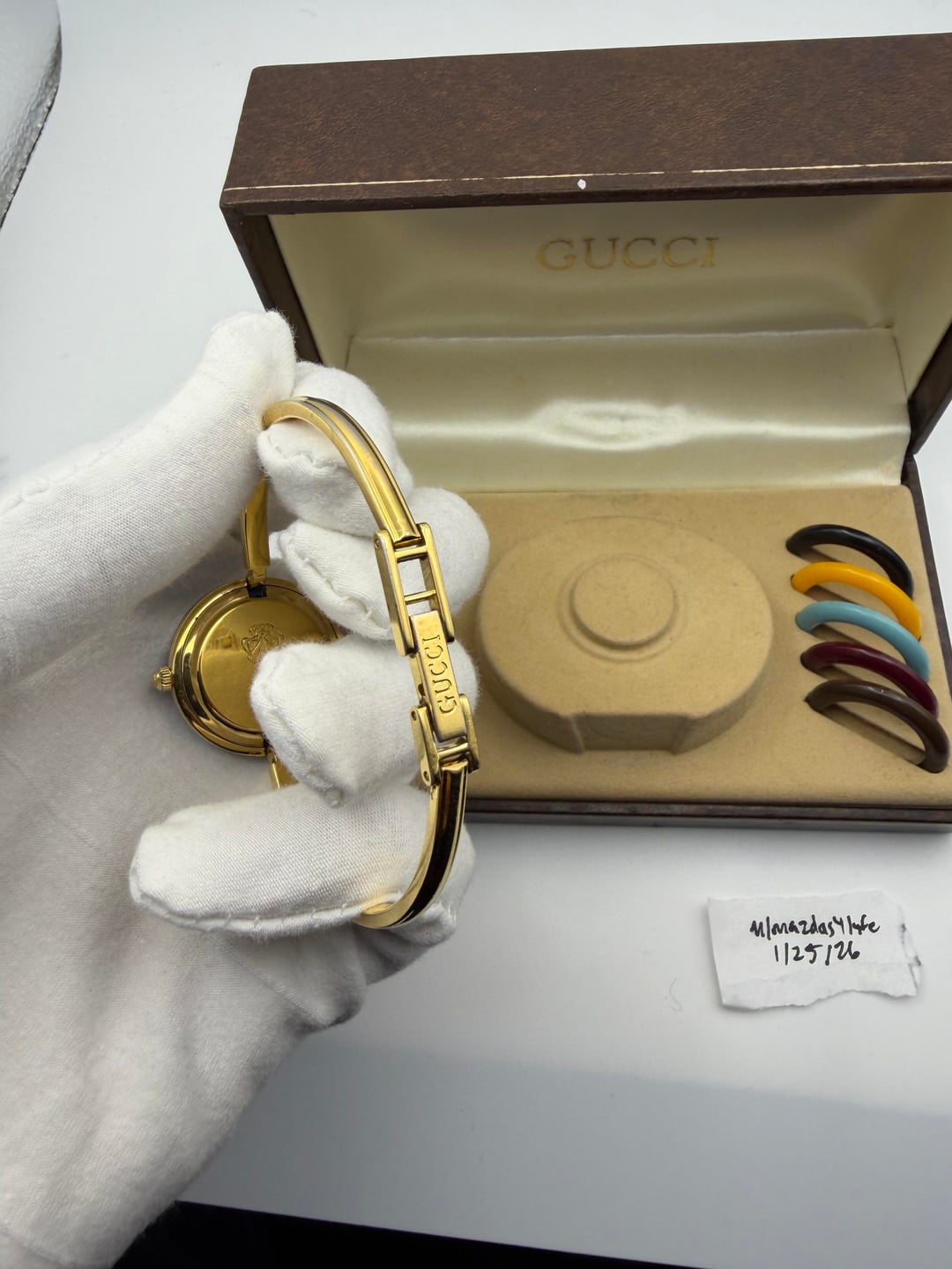 ![[WTS/WTT] Vintage Gucci 11/12.2 (1100L) Gold Bangle Watch w/ Interchangeable Bezels in Original 10 Slot Box Restored 3](https://cdn-cf.watchpatrol.net/600x600/img/full/10a3046a76943354a5f60a71e502413f2ba61cdd.jpg)