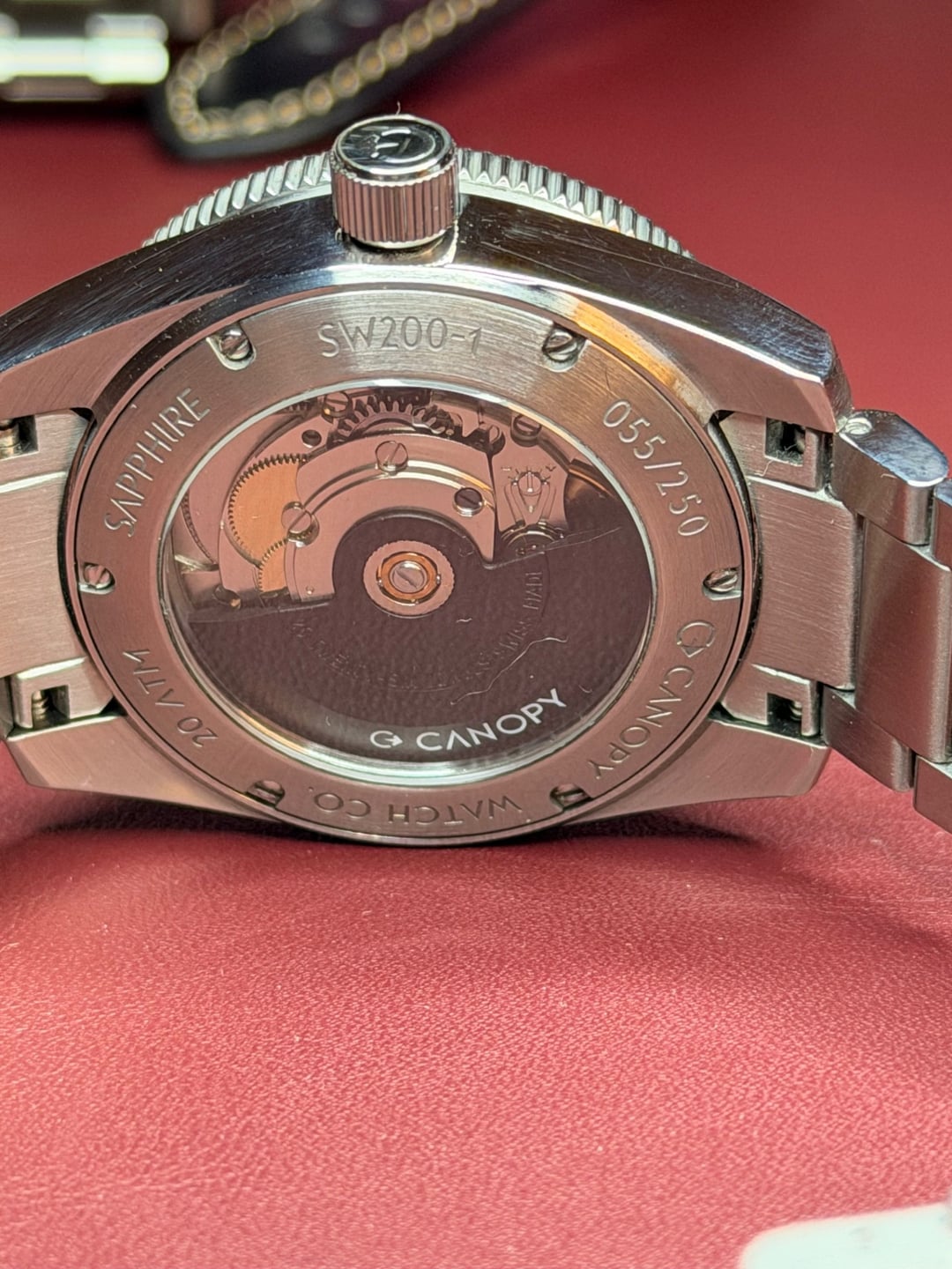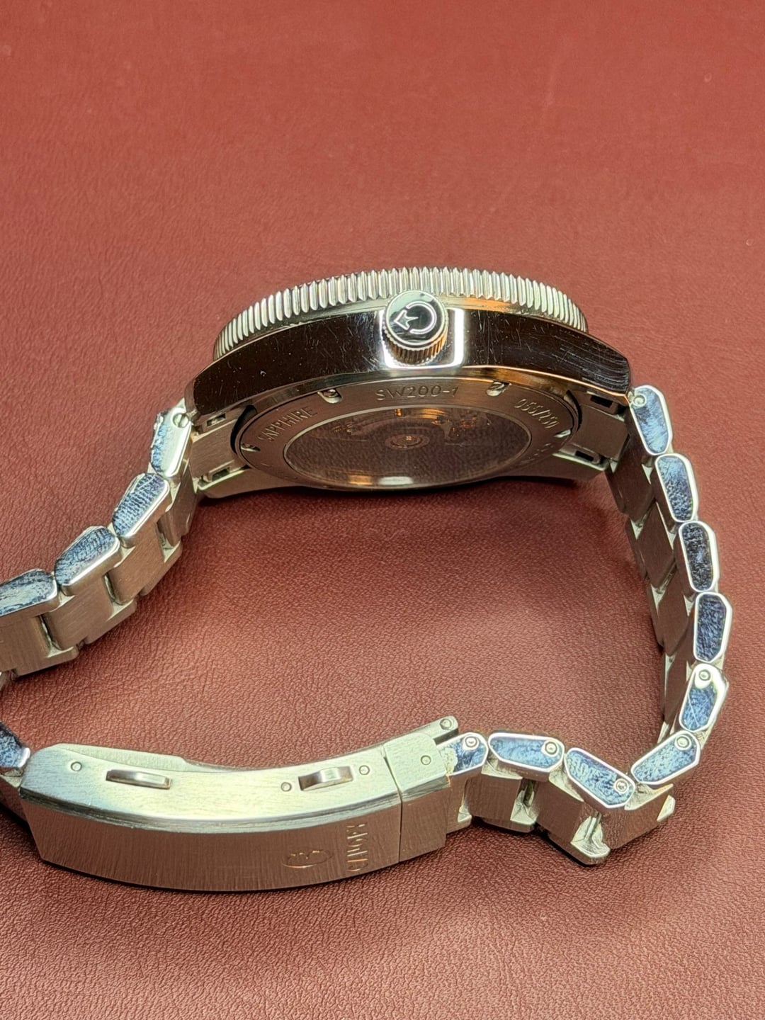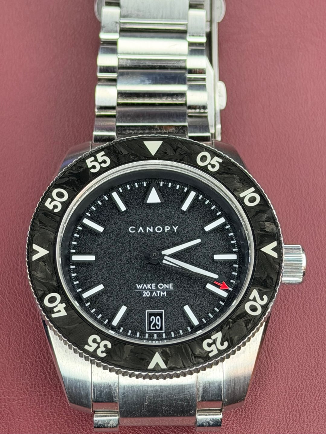 Watch, Box, Card, and full links. Watch has some micro scratches on the case and some desk diving scratches on the clasp. The case scratches look way worse in the pics than what you can actually see. You can really only see them when held at the right angle. In any event the watch is priced appropriately. 316L Stainless Steel case and bracelet 39mm case diameter 12.8mm case thickness (including domed crystal) 46mm lug-to-lug 20mm bracelet width (lugs) tapering to 18mm (clasp) 200m water resist Modified Swiss Sellita SW200-1 movement 41 hour power reserve Double domed sapphire front glass with anti-reflective coating Exhibition sapphire case back Forged carbon fiber bezel insert Forged carbon fiber crown insert On-the-fly toolless micro adjust clasp Swiss Super LumiNova C1 applied to hands, indices, and numerals 6 o'clock date window with color-matched date