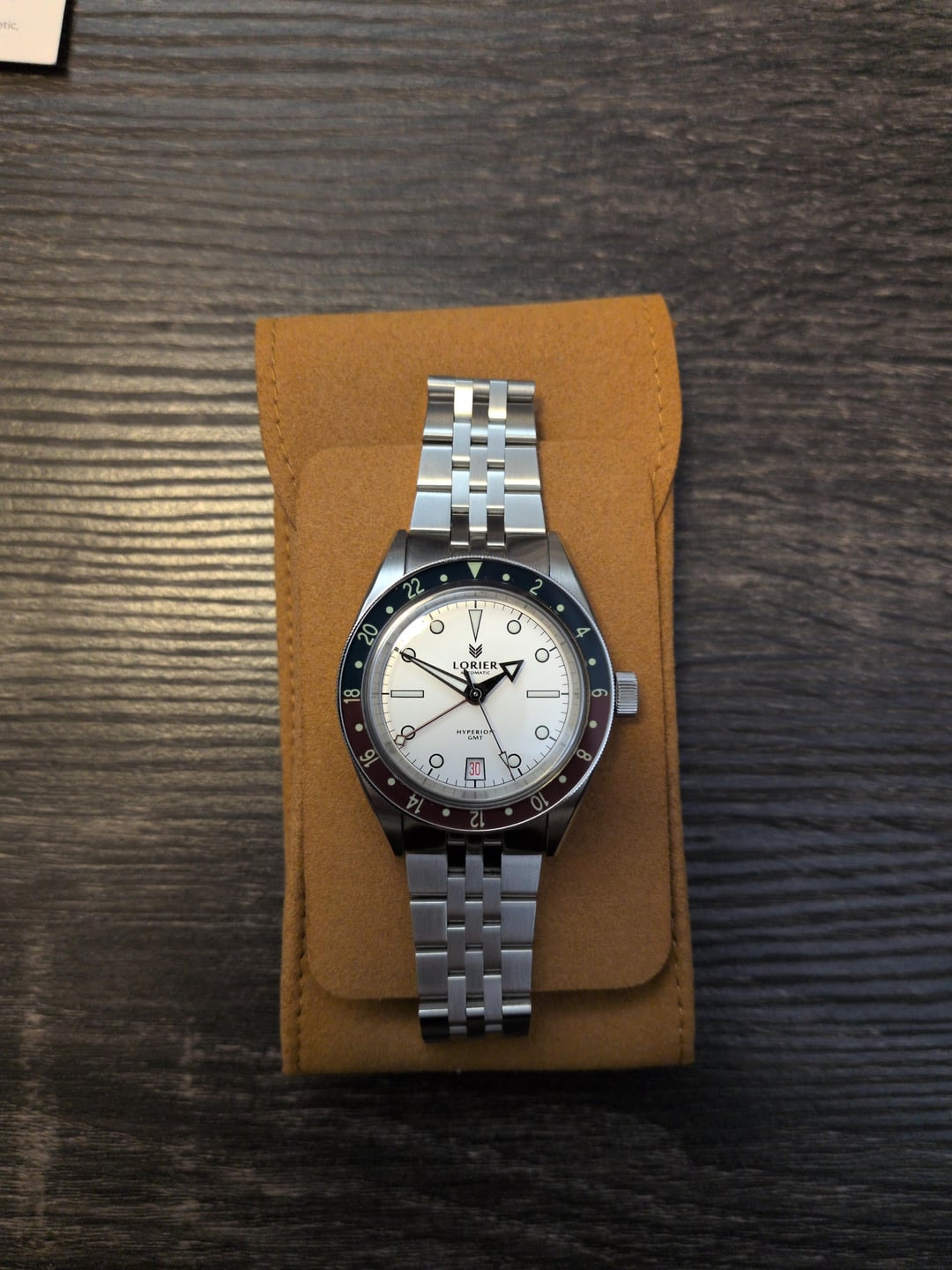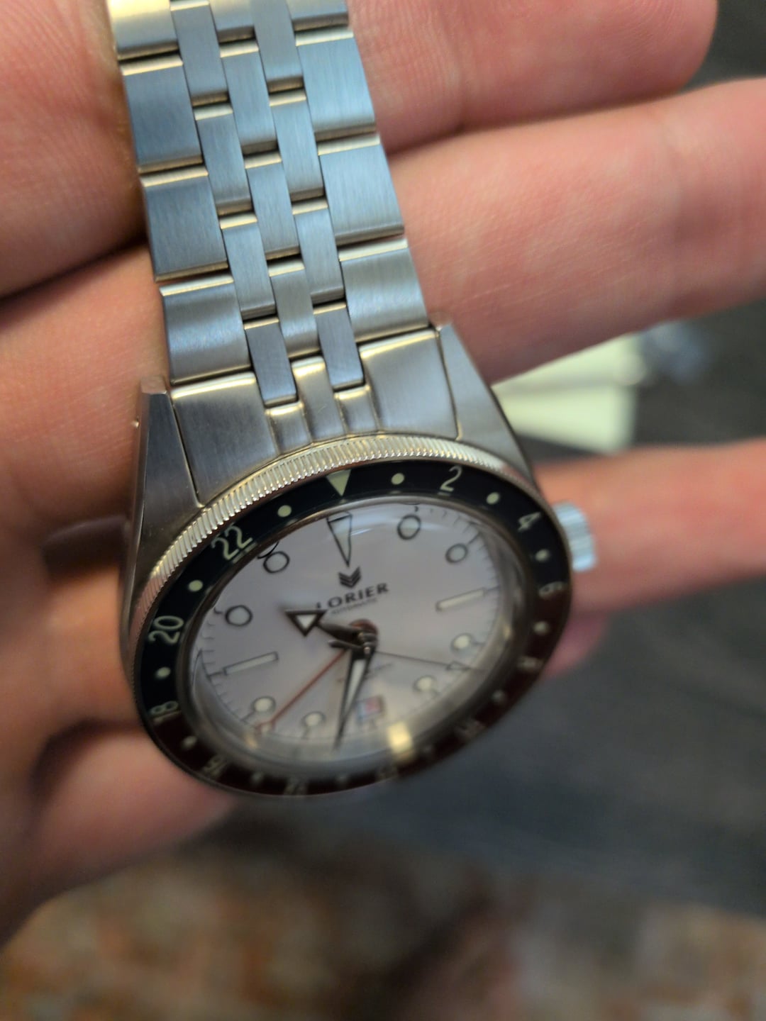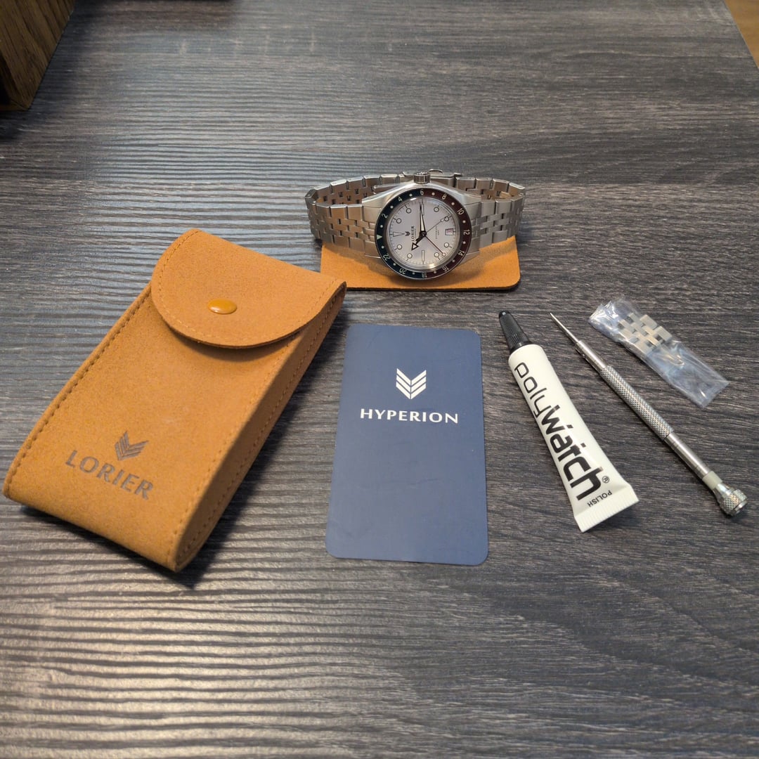 Hi watchex! Up for sale is my Lorier Hyperion Series II special edition variant with a white dial. I'm moving this one on to consolidate the collection as I hardly ever wear it. It's in very good condition as you can see in the photos, with no discernible flaws in the acrylic crystal or bezel. The case and bracelet are in near-perfect condition, with just some dust and minor wear. The clasp bears light desk-diving marks that I've done my best to represent in the photos. This model features the Miyota 9075 "true" GMT movement. Asking price is *US $599 net to me* with free shipping to the continental US. For buyers elsewhere, I'll subsidize your shipping up to the amount that it'd cost to ship within the US. Specs: - 39mm diameter - 46mm from lug to lug - 12.7mm thickness (10.7mm case + 2mm crystal) - 20mm lug width with bracelet tapering down to 16mm - 24-click bidirectional GMT bezel - 100m water resistance with a screw-down crown What you get: - The watch head on the original Epsilon bracelet and clasp - The extra bracelet links - The original Lorier screwdriver - The original tube of PolyWatch (used only once, on a different watch) - The included watch pouch and backing card - The paper card included in the box *(Basically, the full set minus the cardboard outer box and the unbranded polishing cloth)* I'm not sure what the deal is with Lorier's special editions regarding production. Given this model is no longer shown on [their homepage](https://www.lorierwatches.com/), I don't think it's coming back anytime soon.