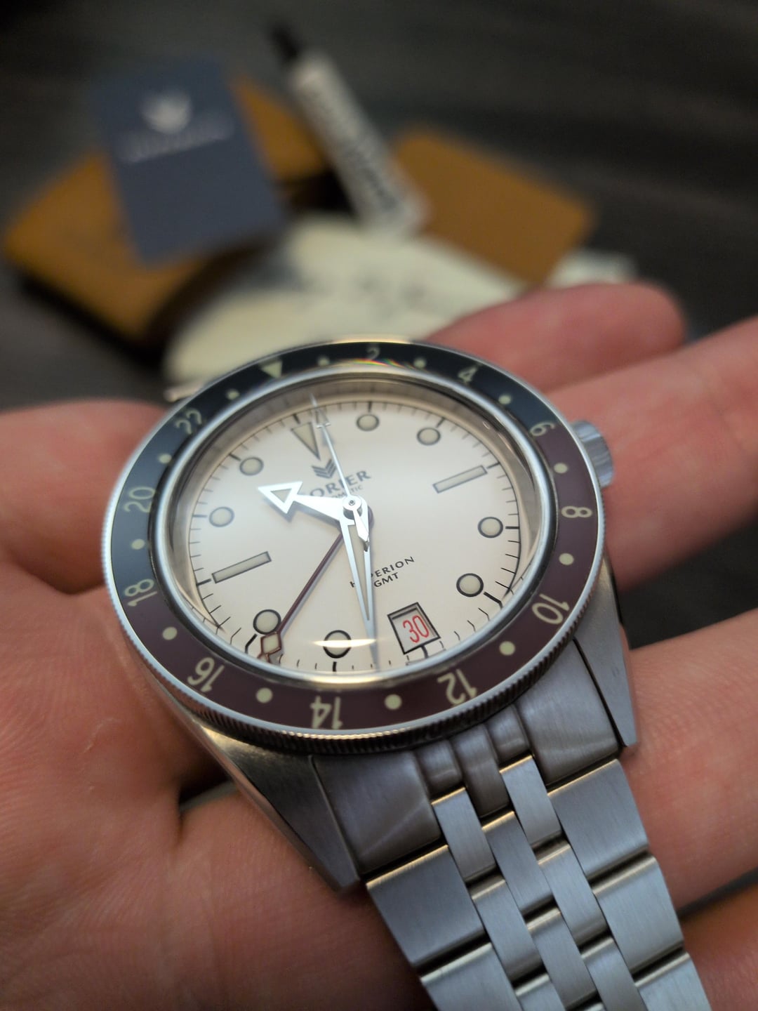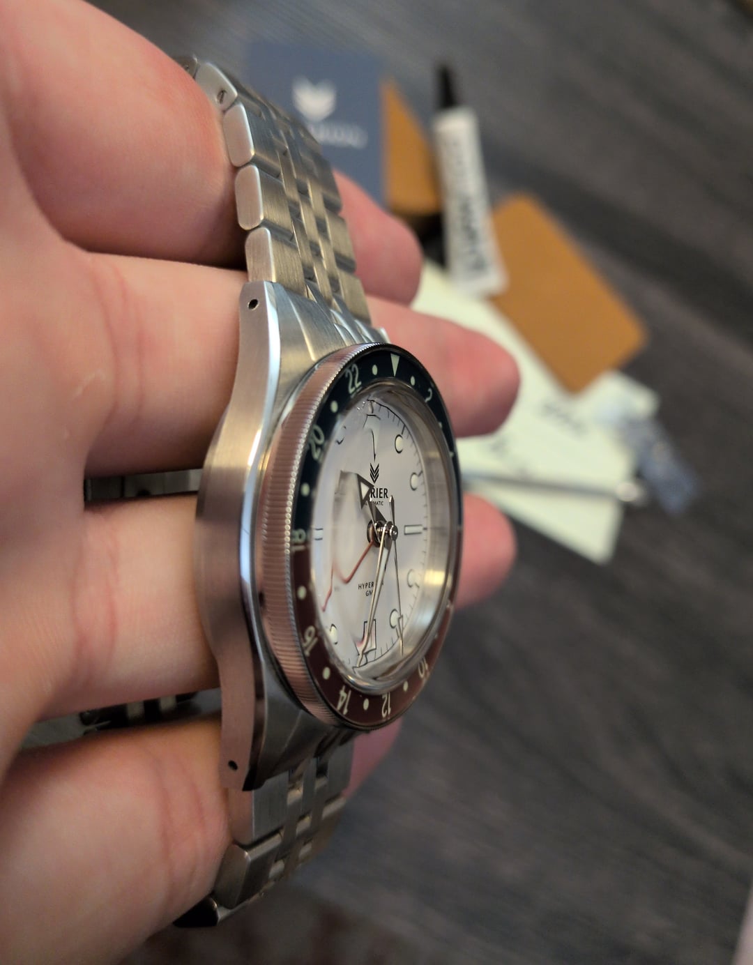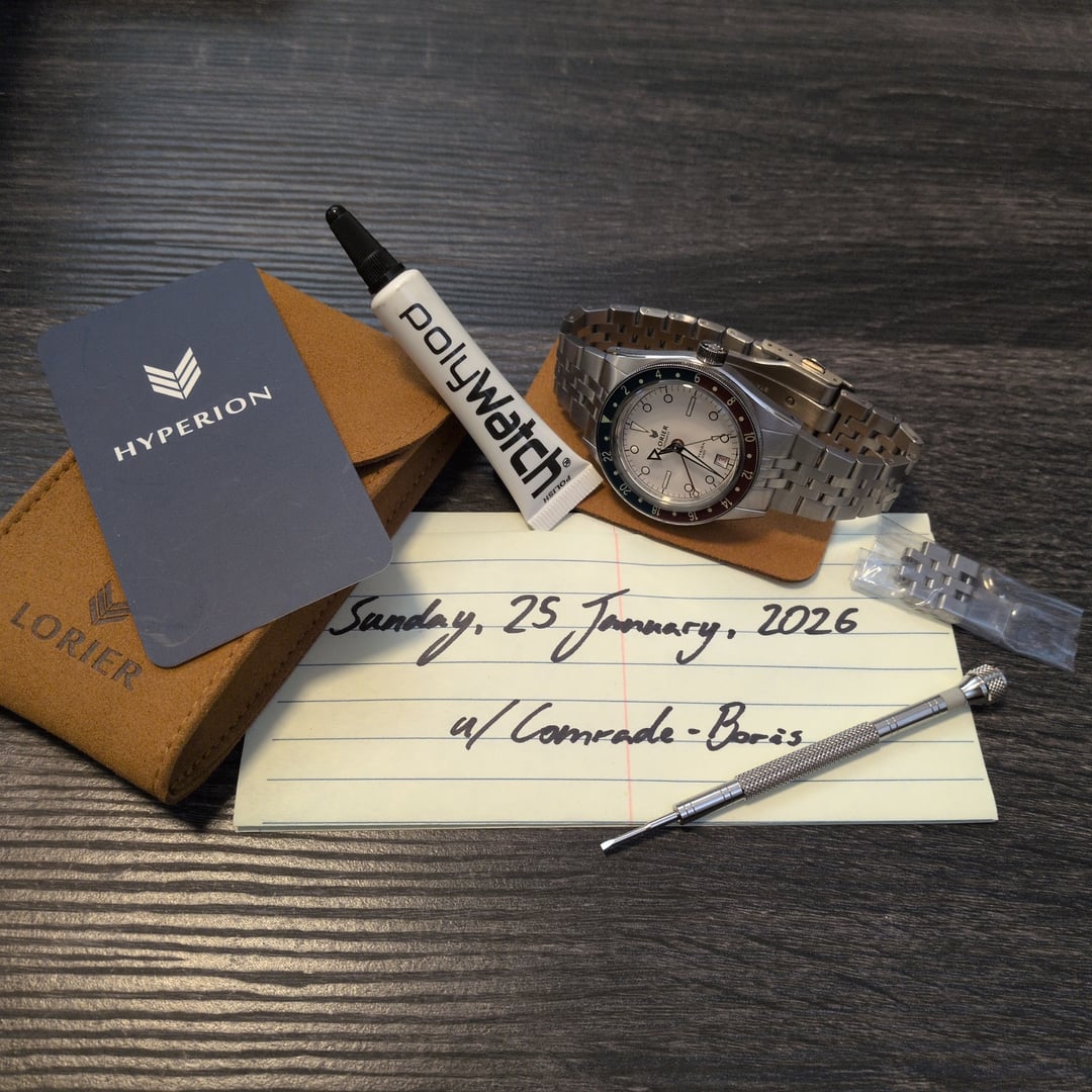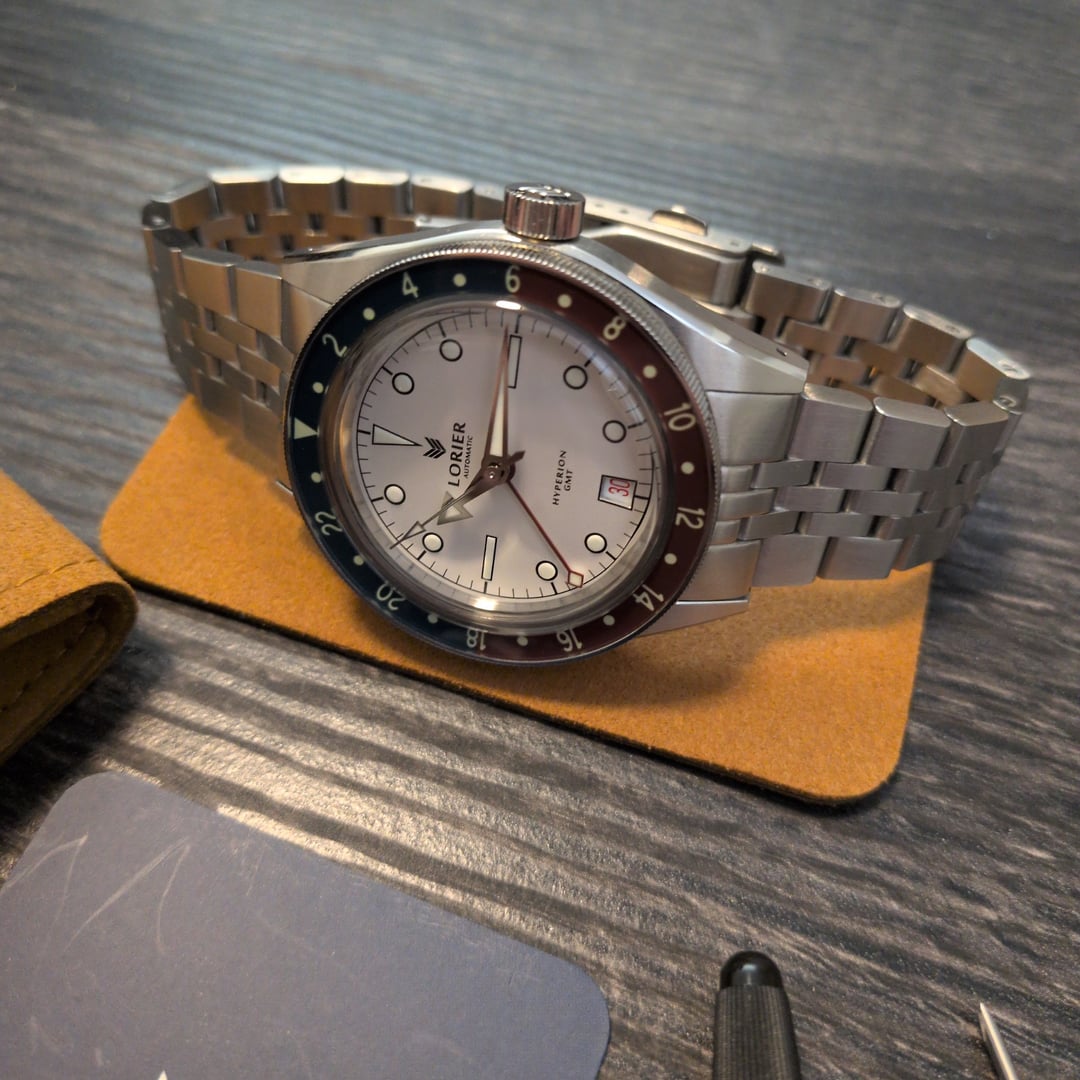 Hi watchex! Up for sale is my Lorier Hyperion Series II special edition variant with a white dial. I'm moving this one on to consolidate the collection as I hardly ever wear it. It's in very good condition as you can see in the photos, with no discernible flaws in the acrylic crystal or bezel. The case and bracelet are in near-perfect condition, with just some dust and minor wear. The clasp bears light desk-diving marks that I've done my best to represent in the photos. This model features the Miyota 9075 "true" GMT movement. Asking price is *US $599 net to me* with free shipping to the continental US. For buyers elsewhere, I'll subsidize your shipping up to the amount that it'd cost to ship within the US. Specs: - 39mm diameter - 46mm from lug to lug - 12.7mm thickness (10.7mm case + 2mm crystal) - 20mm lug width with bracelet tapering down to 16mm - 24-click bidirectional GMT bezel - 100m water resistance with a screw-down crown What you get: - The watch head on the original Epsilon bracelet and clasp - The extra bracelet links - The original Lorier screwdriver - The original tube of PolyWatch (used only once, on a different watch) - The included watch pouch and backing card - The paper card included in the box *(Basically, the full set minus the cardboard outer box and the unbranded polishing cloth)* I'm not sure what the deal is with Lorier's special editions regarding production. Given this model is no longer shown on [their homepage](https://www.lorierwatches.com/), I don't think it's coming back anytime soon.
