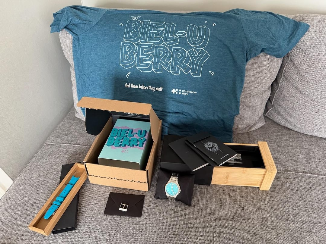 \[WTS\] Christopher Ward Twelve (Ice Cream) - Blue Timestamp: [https://imgur.com/a/fs-christopher-ward-twelve-ice-cream-blue-kn4neWF](https://imgur.com/a/fs-christopher-ward-twelve-ice-cream-blue-kn4neWF) CW info page here: [https://www.christopherward.com/int/Ice-Cream-Twelve-38/C12-38ADA1-S00B2-BRB.html](https://www.christopherward.com/int/Ice-Cream-Twelve-38/C12-38ADA1-S00B2-BRB.html) The Ice Cream Twelve was a limited edition series, released in the summer of 2024 and the first time that the Twelve was available in a 38mm case. Long since sold out, 200 pieces of each colorway were made; this is the Blue variant (or Blueberry or sometimes "Biel-U Berry"), and is numbered 055/200, engraved on the caseback. This model came with the updated bracelet with on the fly mico-adjust, as well as a color-matched rubber strap. I purchased this set directly from CW, and it comes with the remainder of the 5 year warranty. Worn sparingly, the watch is in very good condition. I can't find any marks or blemishes to note, please see pics. Runs well, and within spec. Comes as a full set plus extras: all boxes and sleeves, paperwork, spare links, rubber strap with buckle, an additional unused spare buckle, and an unworn CW "Biel-berry" Ice Cream t-shirt (size L). Asking $1175 net to me, including shipping to the CONUS. No trades at the moment. Open to a face to face deal in San Francisco. I have transaction feedback on Reddit, WuS, and eBay going back several years. Happy to video chat or send custom pics.