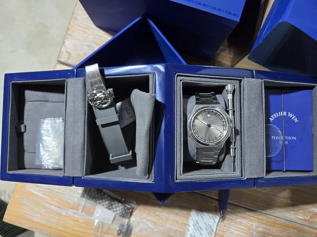 Up for sale is my Atelier Wen Perception Ying. I’ve had this for a little bit now and while it is a great piece, it just hasn’t been getting the wrist time it deserves lately. The Perception series is praised for its top-tier craftsmanship, featuring a fully hand-turned guilloché dial made by China’s first master guilloché craftsman, **Cheng Yucai**. The dial’s four-layer construction draws inspiration from traditional **Sunmao** architectural principles, creating real depth and texture on the wrist. The slim case creates a lightweight, easy wearing watch that can be dressed up with the bracelet, or dressed down with the rubber strap. **Key Specs** * **Model:** Atelier Wen Perception — *Ying (影)* * **Case:** 904L stainless steel, 40mm diameter, 9.4mm thickness, 47mm lug‑to‑lug * **Crystal:** Double‑domed sapphire with 10 layers of AR coating * **Water Resistance:** 100m / 10 ATM * **Dial:** Hand-crafted grey guilloché (écaille de poisson) by Master Cheng Yucai; four‑layer construction; Super‑LumiNova X1 chapter ring * **Movement:** Custom extra‑thin (3.4mm) 32‑jewel Dandong SL1588A automatic; decorated with côtes de Genève and heat‑blued screws * **Bracelet:** 904L steel integrated bracelet with individually chamfered links with quick change spring bars to easily swap between bracelet and rubber, and the bracelet includes a push button micro-adjust for the perfect fit. * **Caseback:** Hammered texture with raised stone lion motif; semi‑display sapphire window **Condition** Has some desk diving marks on the bracelet. Overall in great shape **Price** $2350 Shipped USA. Includes Watch, Bracelet, Rubber Strap, Box and Papers. **Pics and Timestamp** [https://imgur.com/a/atelier-L2lDd6p](https://imgur.com/a/atelier-L2lDd6p)