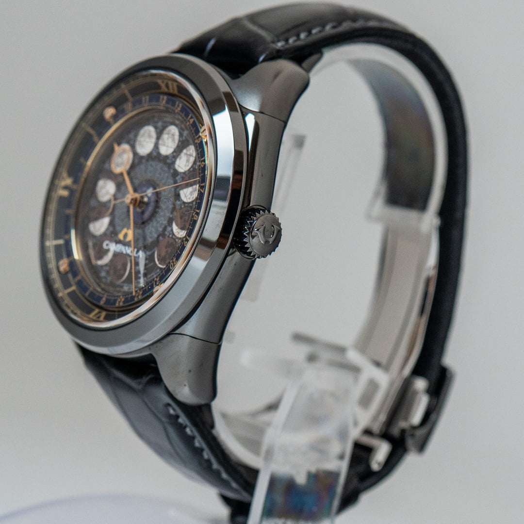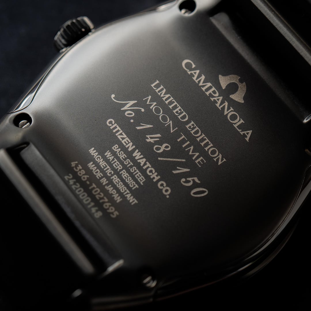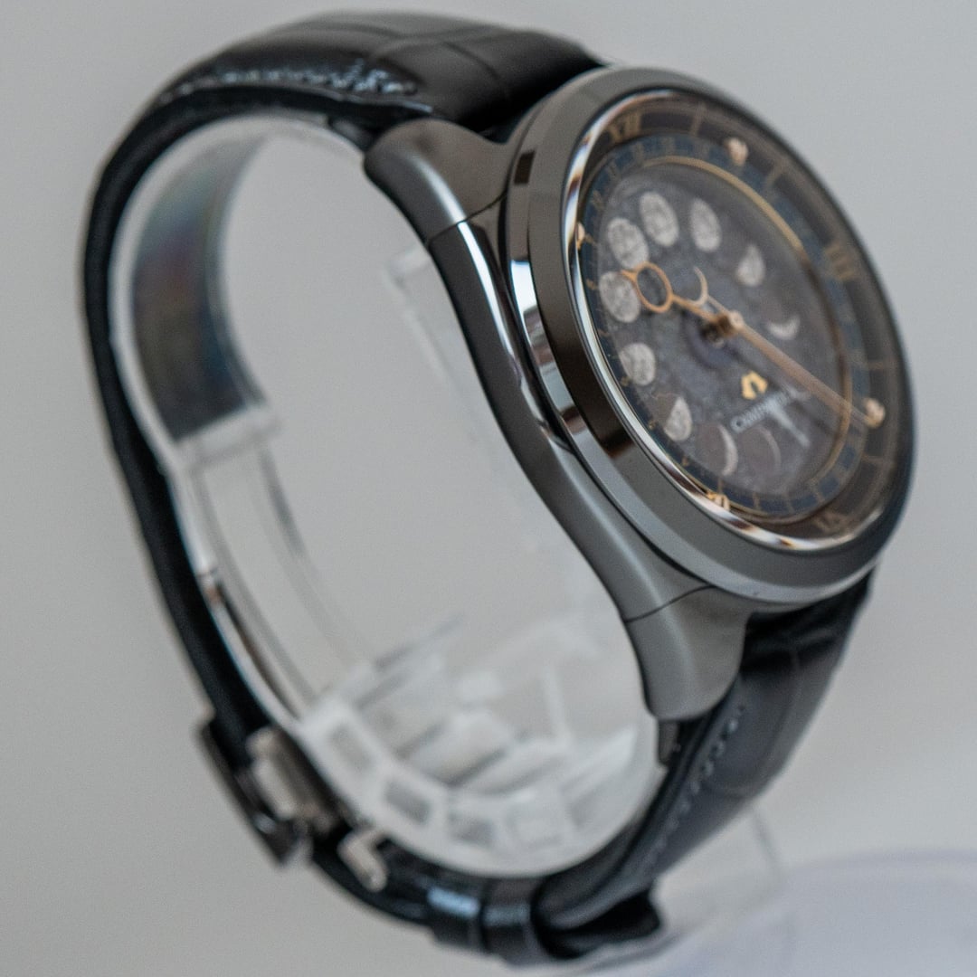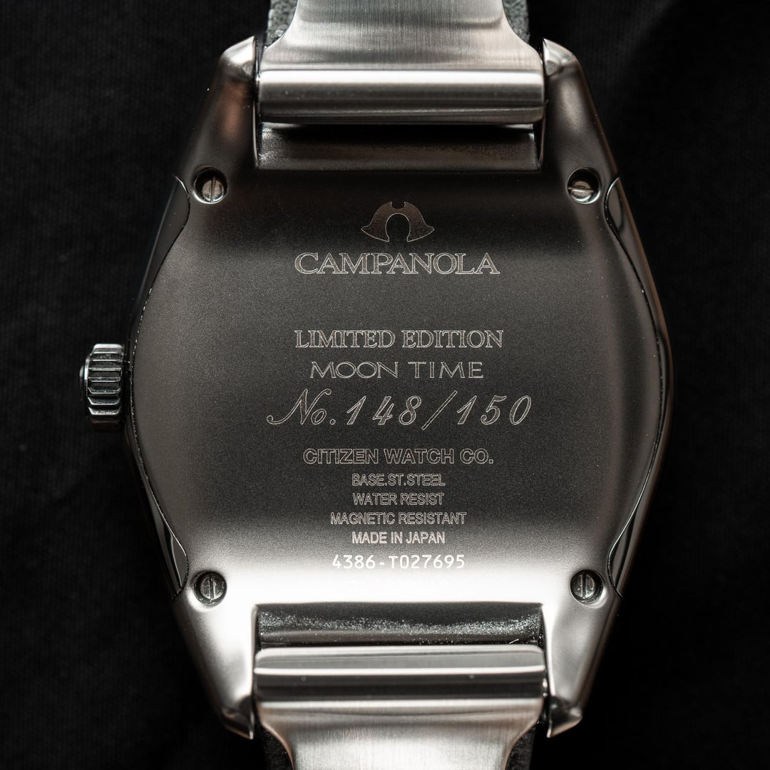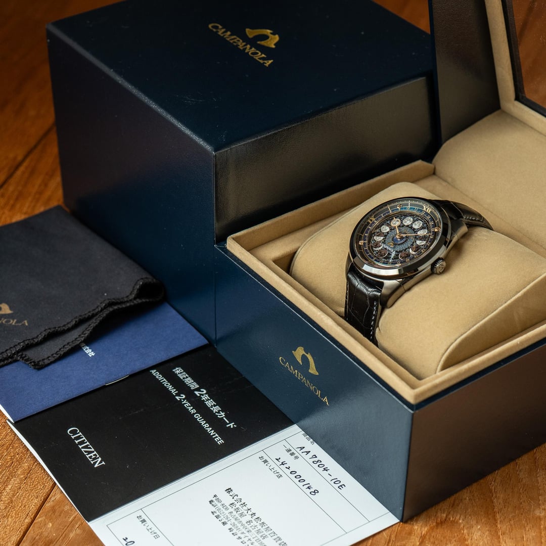 # Reference: **Model:** Campanola "Moon Phases" AA7804-10E **Production Date:** 2022 **Limited Edition:** 150 Pieces **Timestamp:** [https://imgur.com/a/Kv5GpeM](https://imgur.com/a/Kv5GpeM) **Album:** [https://imgur.com/a/s9F0PP9](https://imgur.com/a/s9F0PP9) # Features: **The History.** Citizen’s luxury sub-brand is named after *Nola*, an Italian town, which located in the *Campania* region. The two words were mashed together to form *Campanola*. The Church in Nola is recognised as being the first Church that ever rang its bells to signify time. Not only does the name reflect this story, but the Campanola logo features two bells side-by-side. **The Complication.** Instead of a small disc rotating to reveal a single image of the moon as the month progresses, Citizen has transformed the entire dial into a rotating progression chart. Yes, the dial itself rotates in sync with the lunar month. Not only does this give you an interesting and easy to understand view of the moon’s position every day, but it also gives you a scientifically accurate one that demonstrates: Lunar Age, Lunar Position, Solar Position, Time of Sunrise and Sunset, Time of Moonrise and Moonset, and it's an accurate drawing of the moon and its craters. **The Accuracy.** I can only assume that fully understanding the manual for this watch is the first step towards starting your career as NASA. I can’t even begin to try to explain it here, so please consider reading it yourself. [It’s as interesting as it is utterly insane](https://www.citizenwatch-global.com/support/pdf-guide/4386/e.pdf). Regardless of whether or not you make it through the manual and understand everything (I think your PhD gets mailed to you automatically) or not, the watch looks incredibly sharp. I suspect that even just using it as a daily moon calendar will leave most people feeling very satisfied. **The Craftsmanship.** Much like Grand Seiko, the Campanola collection is hand-assembled, from the movements to the watch itself. Even the quartz movements, like this one, are hand-assembled! The case is hyper-polished and coated with Citizen's proprietary surface-hardening Duratect, and the domed sapphire features Citizen’s proprietary multi-layered AR coating system, known as Clarity Coating. **The Size.** Like a lot Campanolas it seems large on paper, but the 45mm case width is neutralised by the tiny lugs and leather strap. The photographs show it on my 6.5 inch wrist. # Details: **Condition:** In great condition overall. Appears to be unworn. No easily noticeable marks. **Scope**: Full box and papers **Movement**: Citizen 4386 Moonphase Quartz **Dimensions:** \- Case width: 45.0mm \- Case Thickness: 13.9mm \- Lug Width: 21mm **Price:** Priced at **$2200 + shipping**. Various payment methods accepted. Not accepting trades. Transaction Fees paid by the buyer. **Of note:** Nothing to report.