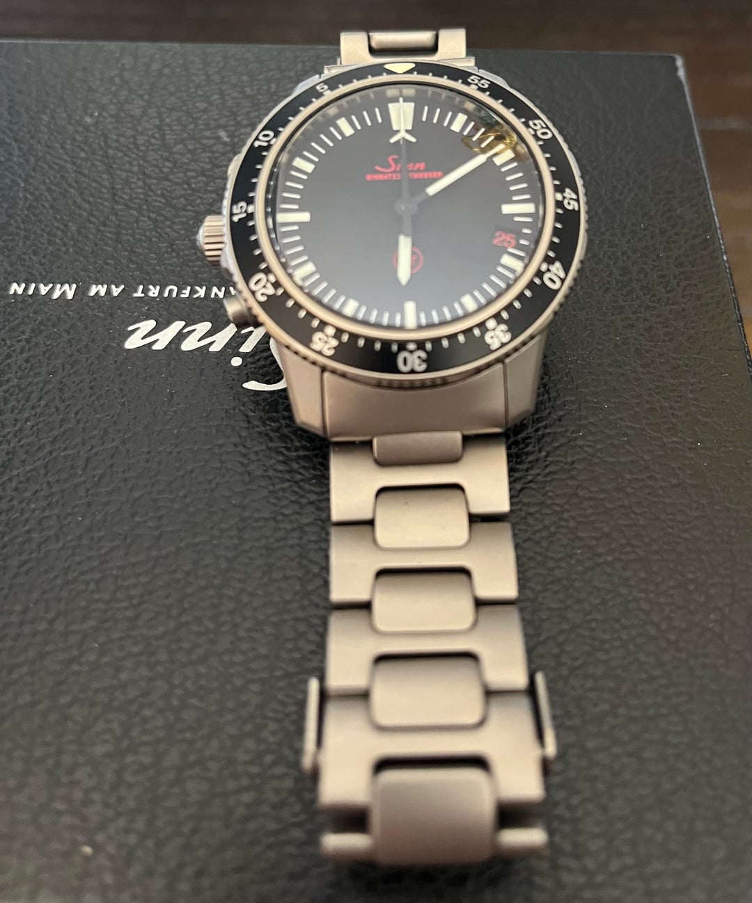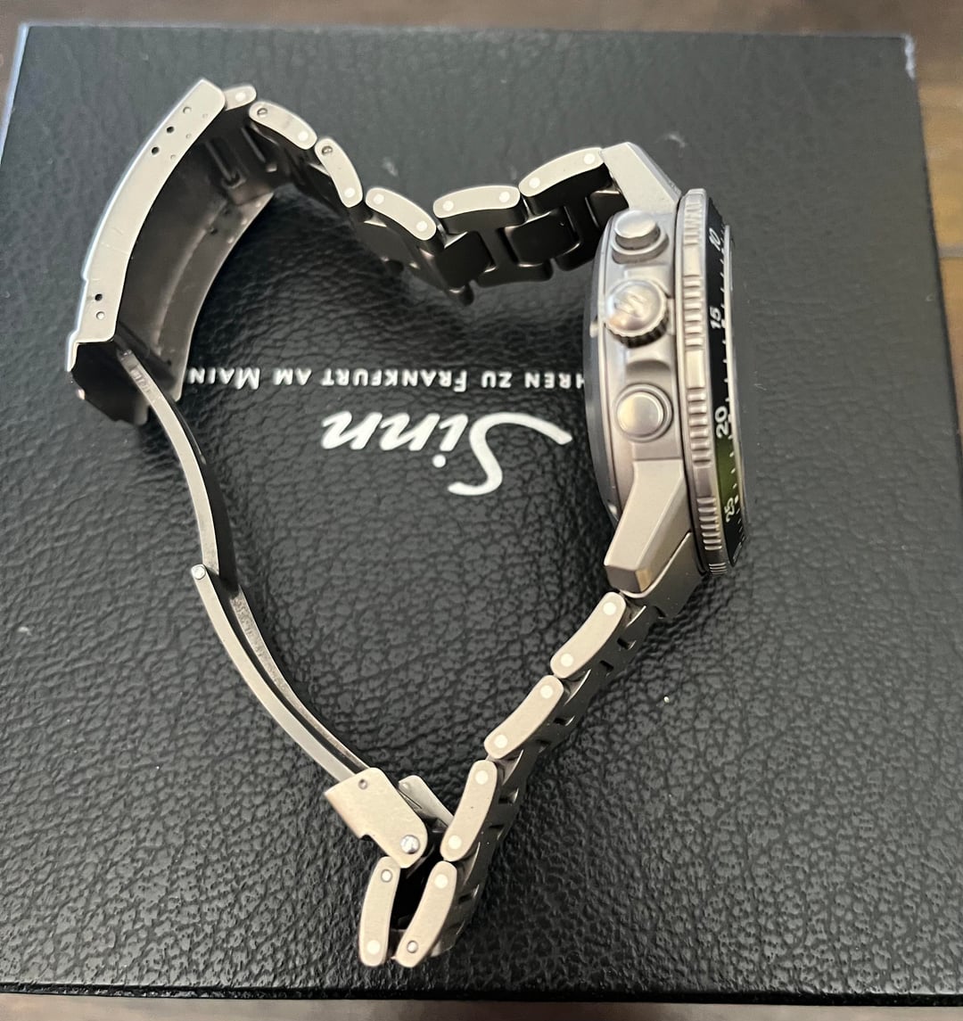 Sinn EZM1 Working flawlessly and keeping good time Service by Sinn in 2018 by previous owner Sized to 7.5” wrist One additional link included Desk diving scratches on clasp Lemania 5100 Self-winding mechanism 17 bearing jewels 28,800 semi-oscillations per hour Seconds stop function Shock resistant as per DIN ISO 1413 Anti-magnetic as per DIN 8309 Case Case made of titanium, bead-blasted Case back made of titanium, Nickel-free Sapphire crystal glass in front Case back screw-fastened Meet the technical requirements for waterproofness, as set out in standard DIN 8310 Pressure-resistant up to 30 bar Low pressure resistant Functions Hours, minutes, seconds Date display Chronograph with centred 60-minute stopwatch hand Pilot’s bezel with luminous key mark Dimensions and Weight Case diameter: 40 mm Band lug width: 20 mm Case thickness: 16 mm Weight without strap: 61 gramme $5600 (net) shipped in the US International shipping can be negotiated
