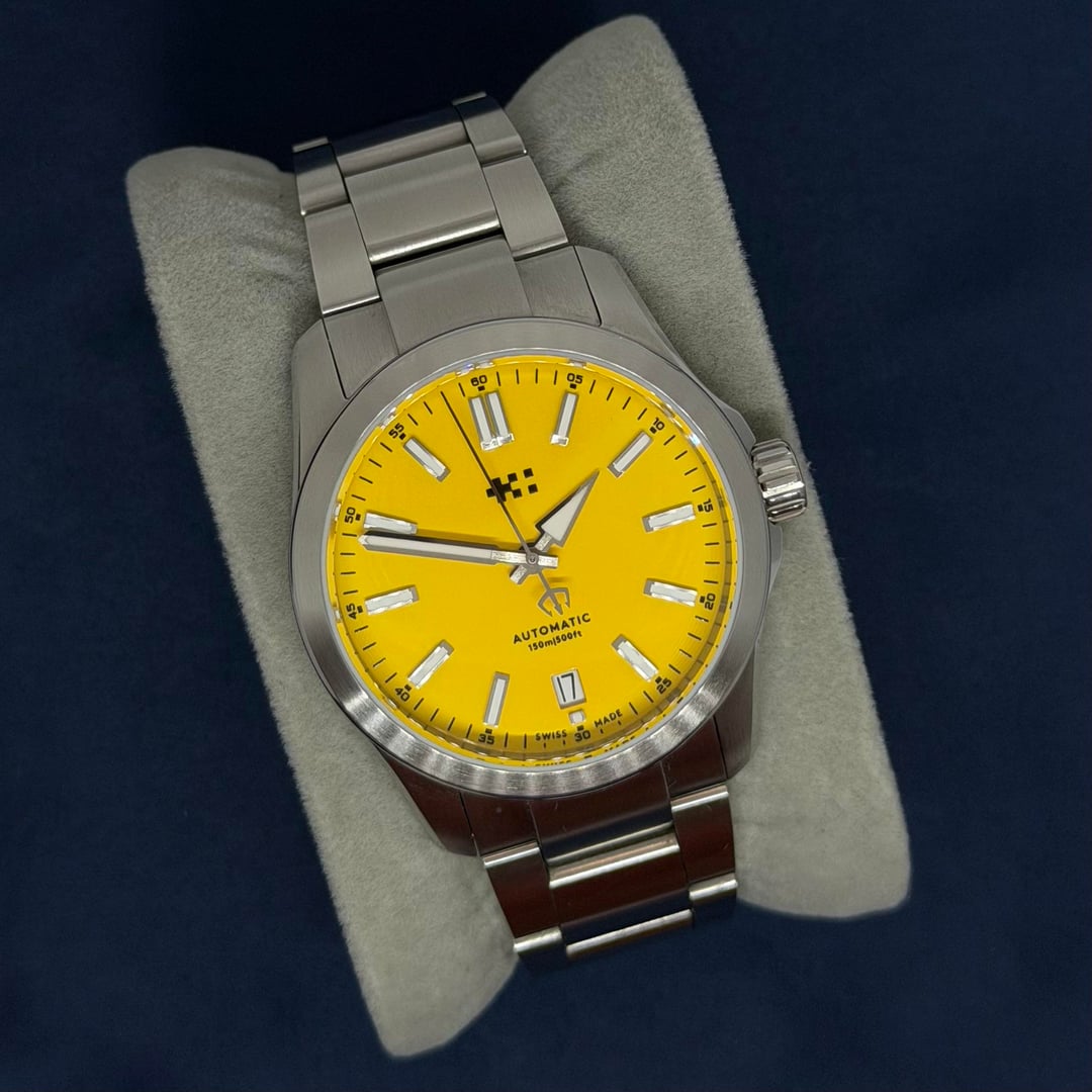 The watch is in excellent condition with minimal signs of wear (light desk dives). Comes in full kit. Vibrant Yellow dial (Limited/Special color). Diameter: 36mm Lug to Lug: 42.87mm Thickness: 11.25mm Case: 316L Stainless Steel Movement: Sellita SW200-1 Automatic Water Resistance: 150m Crystal: Sapphire with AR coating Strap: Steel bracelet with micro-adjust clasp + the original yellow leather strap 1000€ shipped within EU (for US add 70€)- payment with PayPal FF / Wise / Revolut / Bank / GS (buyer covers fees)