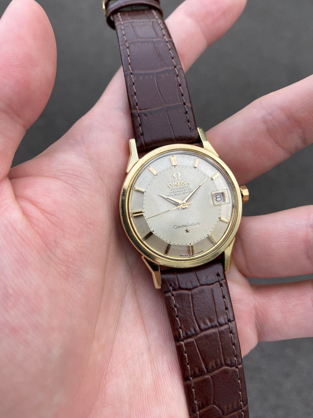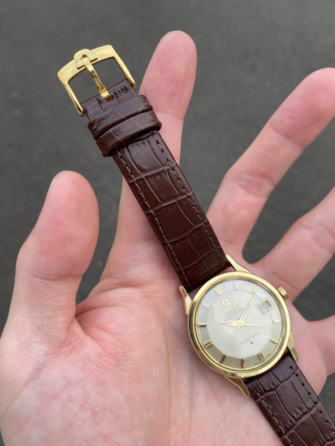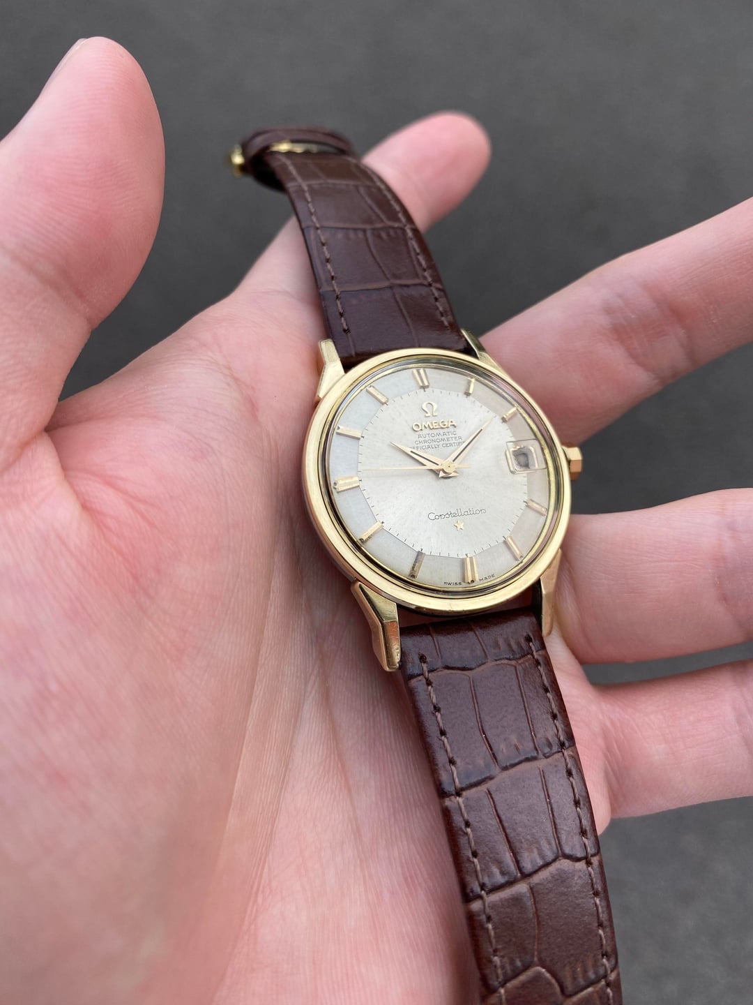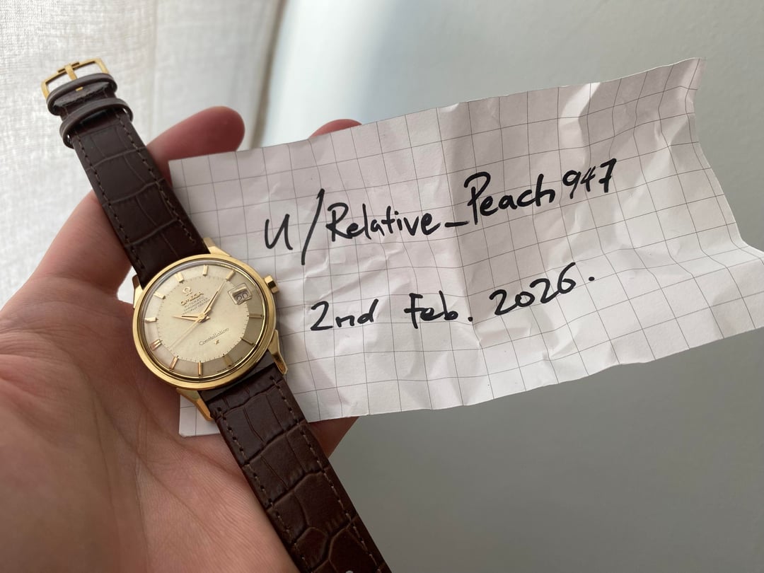 Hi everyone! I’m putting up a beautiful Omega Constellation ‘Pie Pan’ in a gold-capped execution. This is the well known and sought after dog-legged gold-capped model, bearing the reference 14902, which was Omega’s older numbering system before they switched to the 168.005 system later around the mid 60s, and is essentially the same watch. The popularity and significance of the ‘pie pan’ is well known, and this one is no exception—it’s a pretty piece in person! It has a great construction and feel to the gold-capped case design, and the well-proportioned 35mm dimension (excluding the crown), signature dog-legged lugs, and flat profile makes for an excellent dressy statement piece.  The dial is very well preserved, and apart from some very light but negligible patina on the outer edges on the dial, everything is in great condition. The robust caliber 561 automatic movement with date runs well with a recent service in December of 2025. Its beautiful 14K real gold-capped case has definitely seen some polishing in its lifetime; however since gold is naturally a soft material, this is inevitable; but all edges and angles are where they should be and visible.  The gold observatory emblem on the case back is also untarnished with original textures in the background. Its crown is also its correct 10-sided one with the period-correct logo. I’ve paired it with a new faux-alligator style leather strap in a nice brown colour, with a gold Omega pin buckle. I’m looking for $2400 shipped all-in from Singapore, with any custom taxes covered by me, via reliable Fedex, to wherever you may be. I accept payment through Wise (preferred) or bank wire. Please let me know if you have any questions! I am also open to reasonable offers. Thank you! David