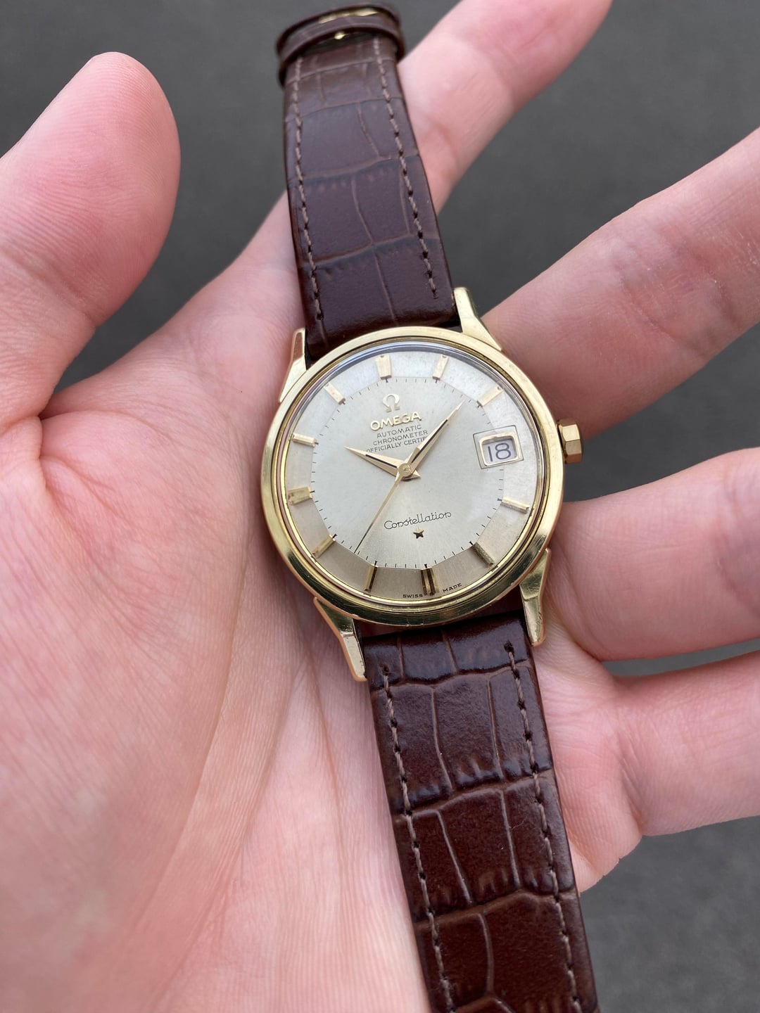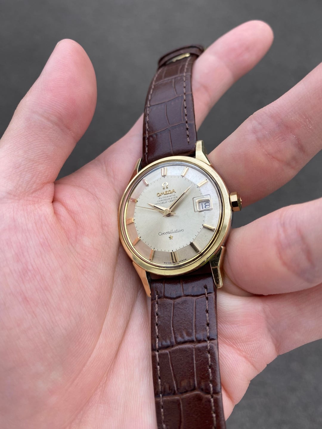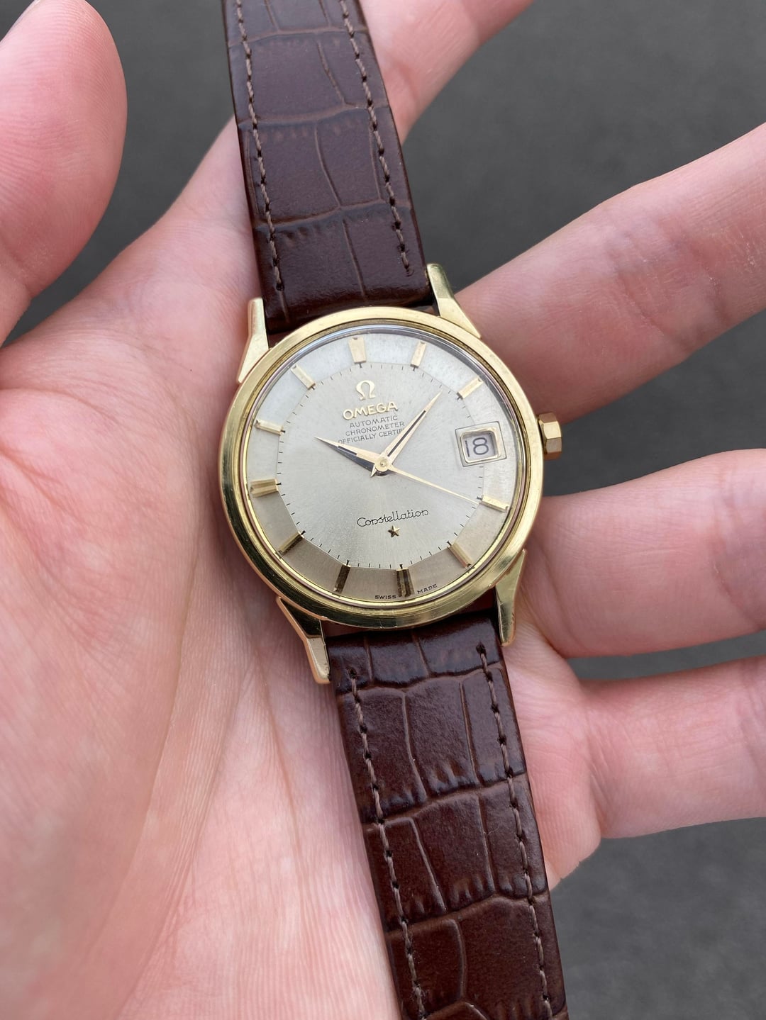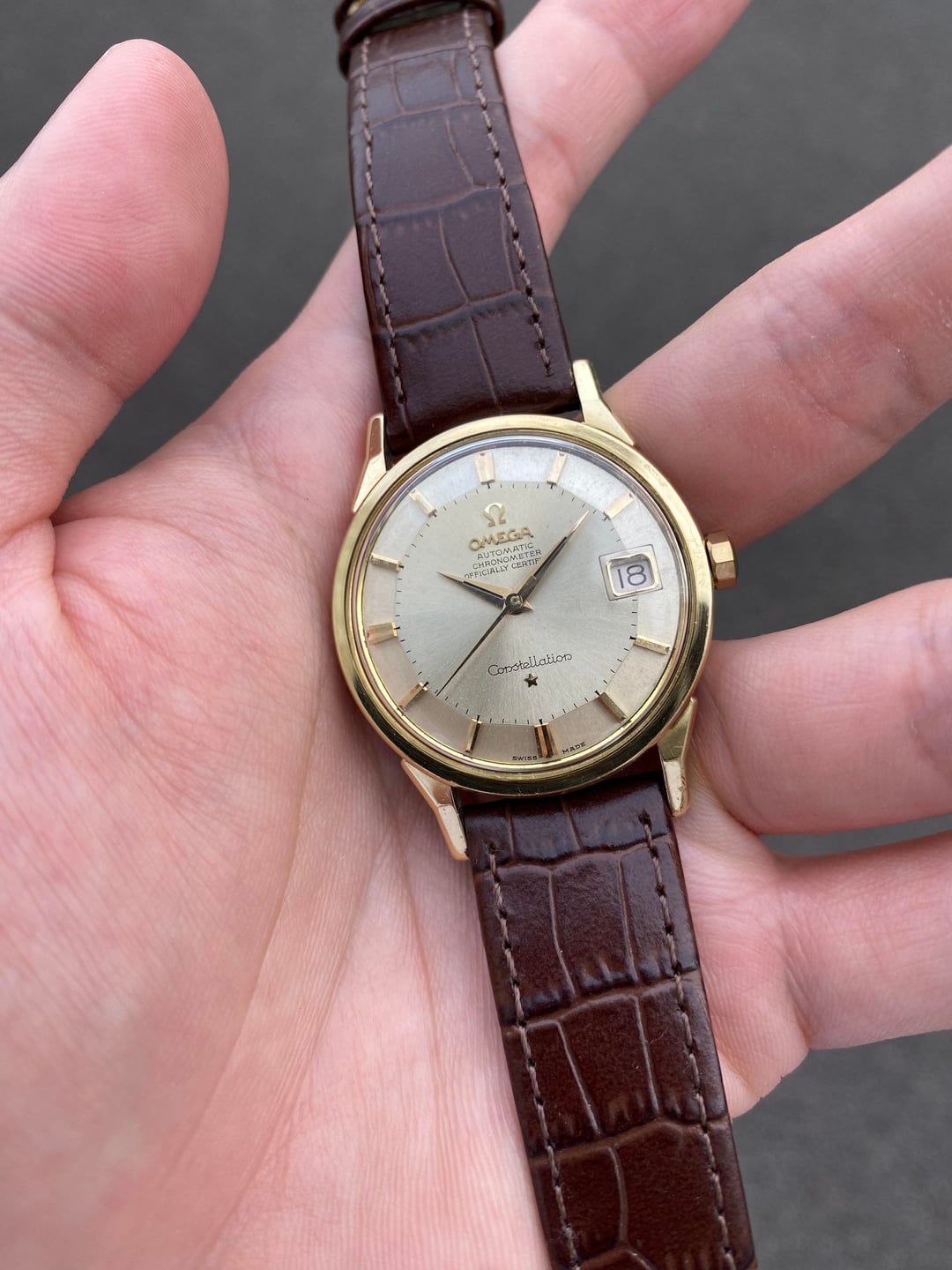 Hi everyone! I’m putting up a beautiful Omega Constellation ‘Pie Pan’ in a gold-capped execution. This is the well known and sought after dog-legged gold-capped model, bearing the reference 14902, which was Omega’s older numbering system before they switched to the 168.005 system later around the mid 60s, and is essentially the same watch. The popularity and significance of the ‘pie pan’ is well known, and this one is no exception—it’s a pretty piece in person! It has a great construction and feel to the gold-capped case design, and the well-proportioned 35mm dimension (excluding the crown), signature dog-legged lugs, and flat profile makes for an excellent dressy statement piece.  The dial is very well preserved, and apart from some very light but negligible patina on the outer edges on the dial, everything is in great condition. The robust caliber 561 automatic movement with date runs well with a recent service in December of 2025. Its beautiful 14K real gold-capped case has definitely seen some polishing in its lifetime; however since gold is naturally a soft material, this is inevitable; but all edges and angles are where they should be and visible.  The gold observatory emblem on the case back is also untarnished with original textures in the background. Its crown is also its correct 10-sided one with the period-correct logo. I’ve paired it with a new faux-alligator style leather strap in a nice brown colour, with a gold Omega pin buckle. I’m looking for $2400 shipped all-in from Singapore, with any custom taxes covered by me, via reliable Fedex, to wherever you may be. I accept payment through Wise (preferred) or bank wire. Please let me know if you have any questions! I am also open to reasonable offers. Thank you! David