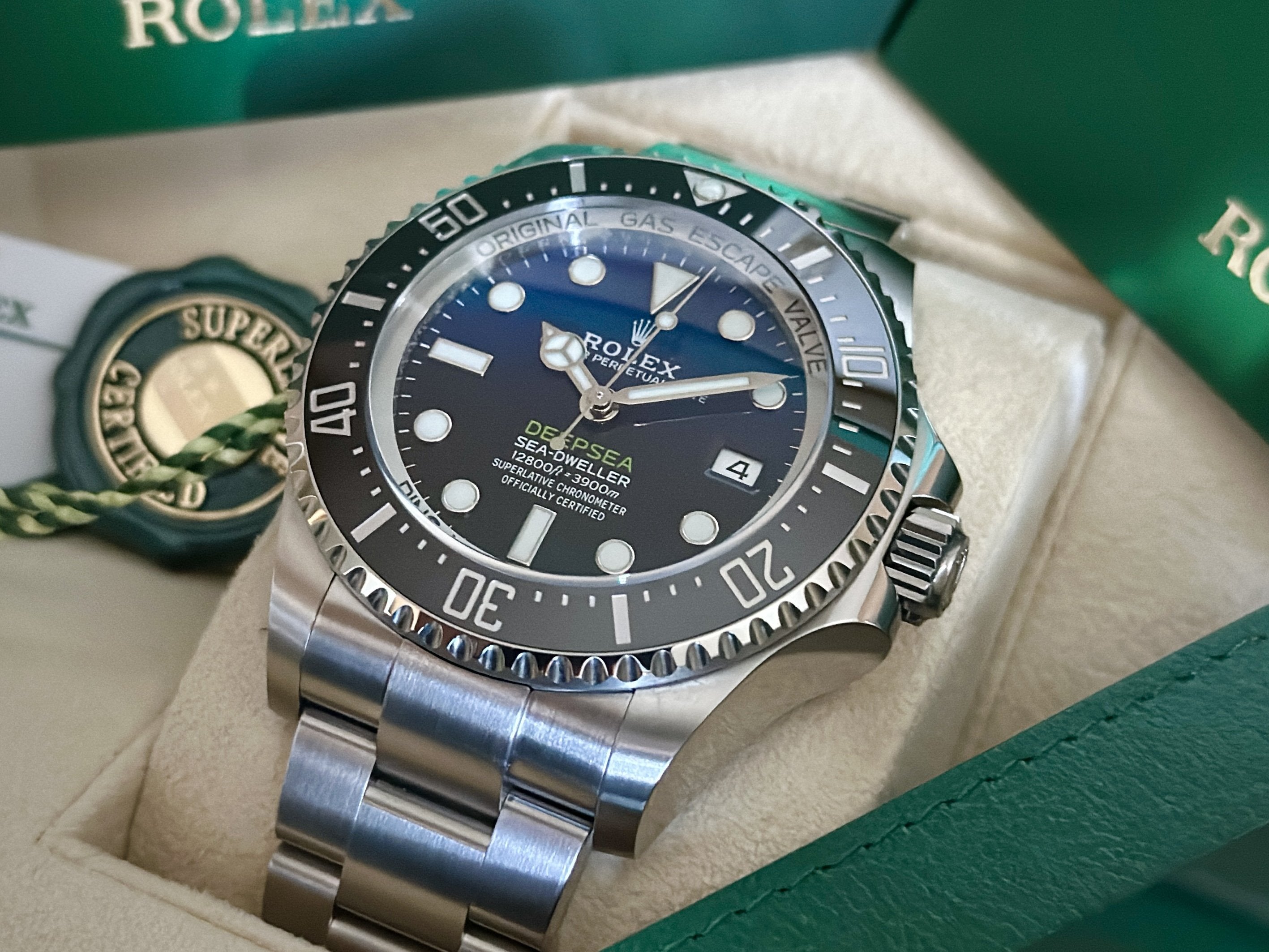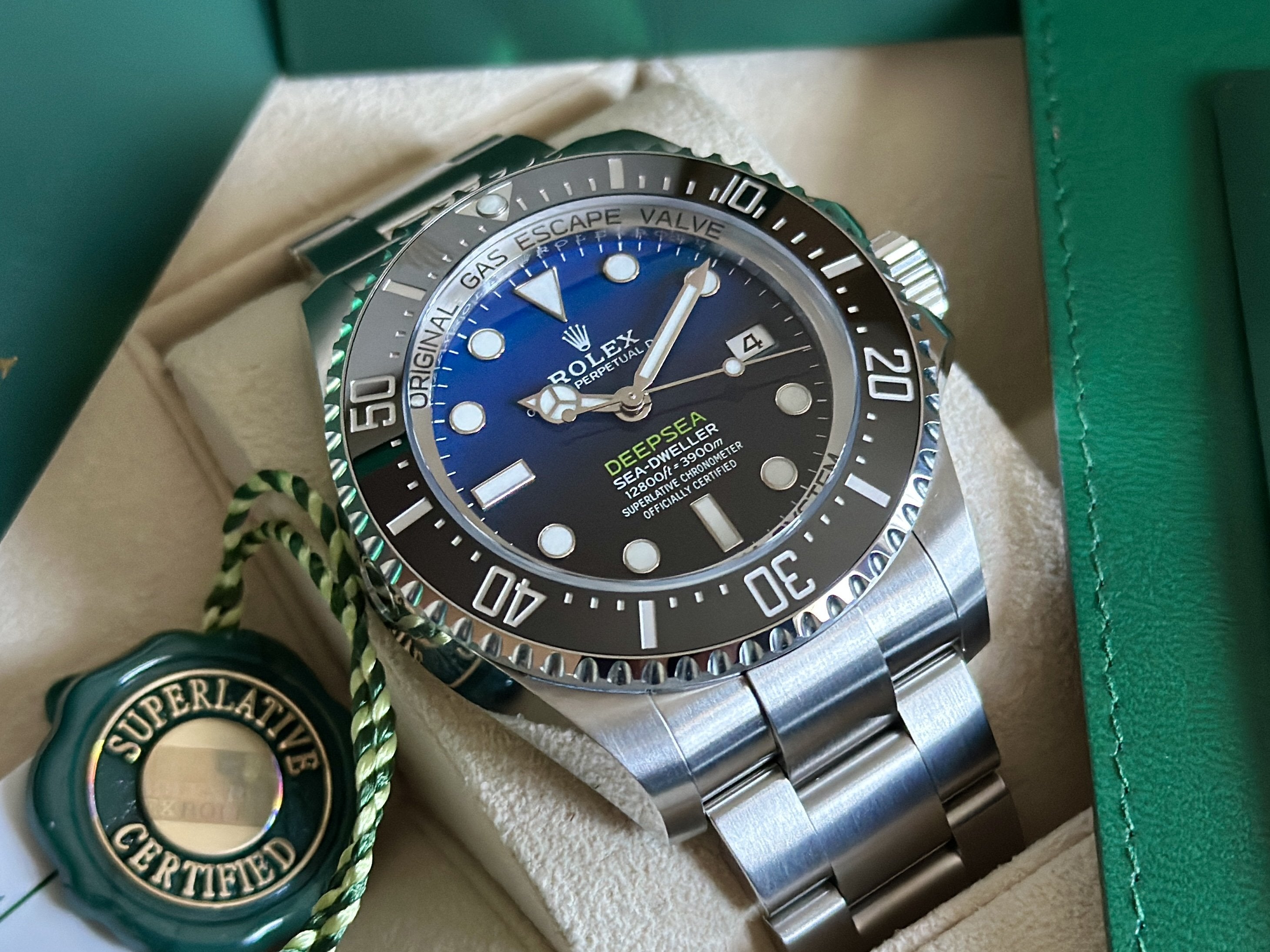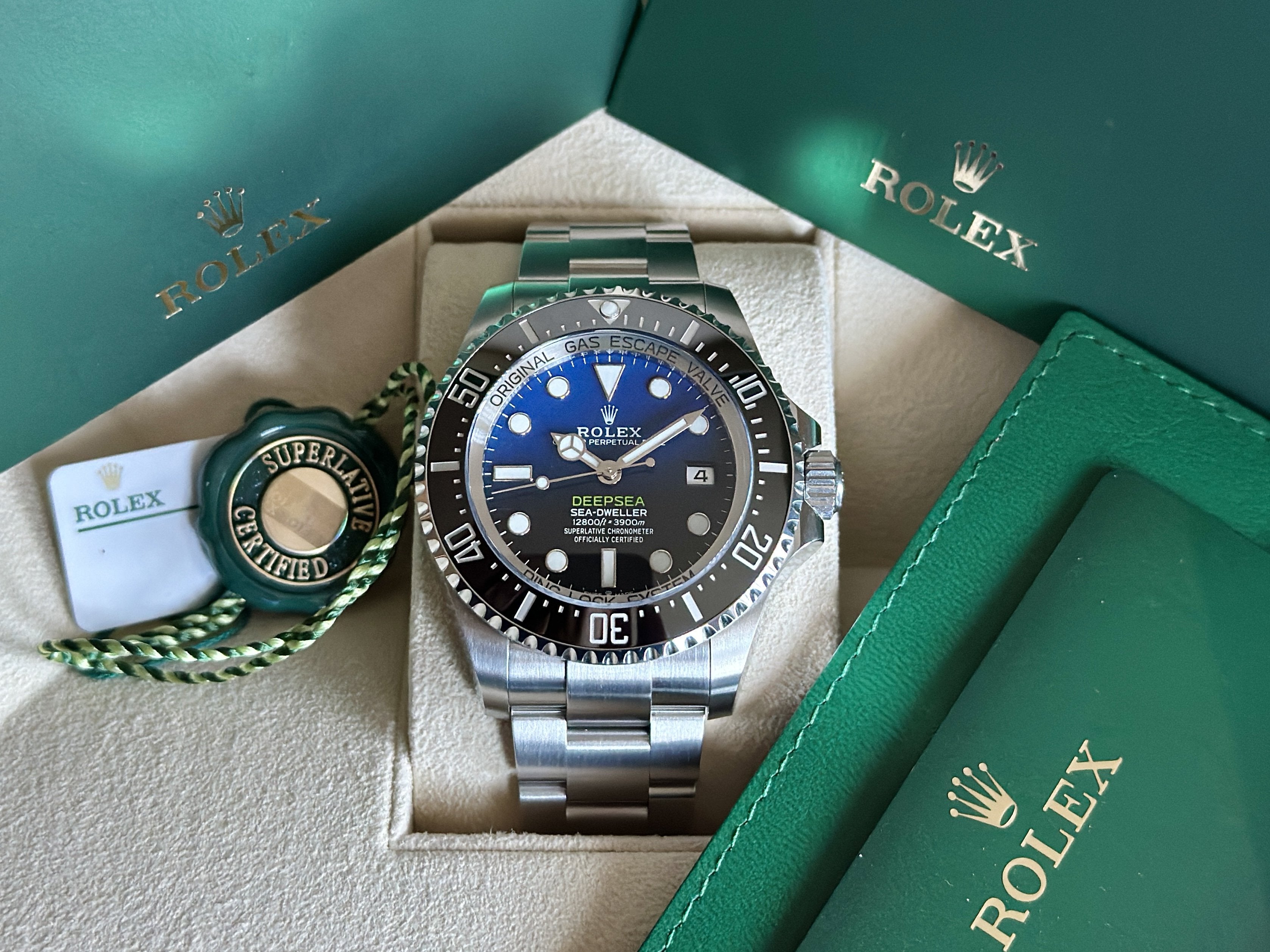 44mm DSSD James Cameron Blue/Black Dial. Watch remains unsized/unworn. Comes as a full set with inner/outer boxes, outer sleeve, white serial tag, green cosc tag, booklets, card holder and original warranty card dated 09.2023. Factory Warranty til 2028
