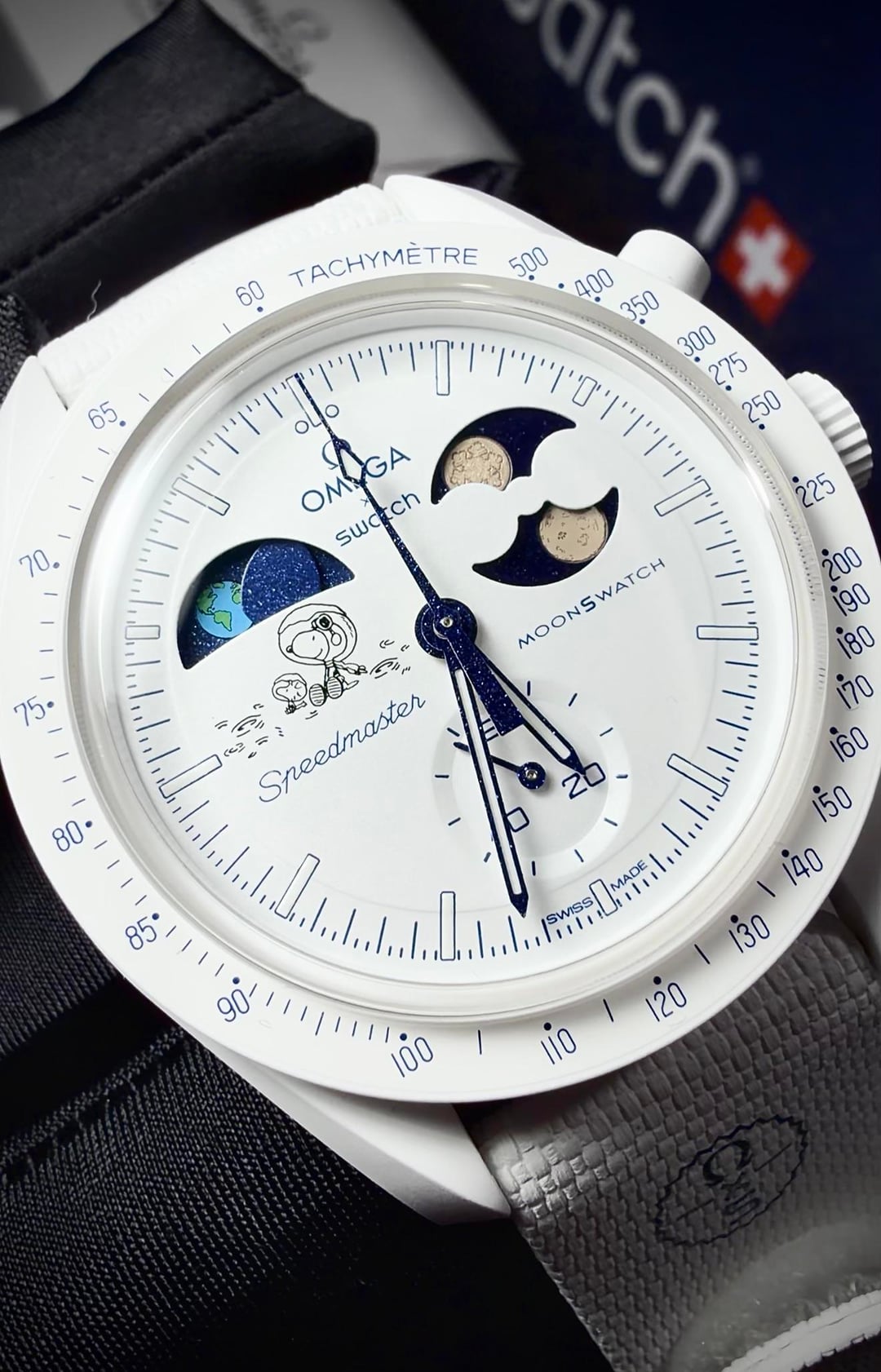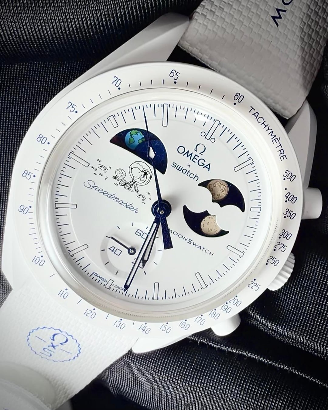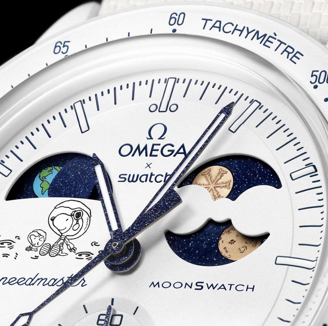 This piece features a beautiful Earthphase indicator at 10 o'clock with oceans that glow blue under UV light, plus the iconic Snoopy & Woodstock artwork on the dial that makes this watch a total conversation starter.