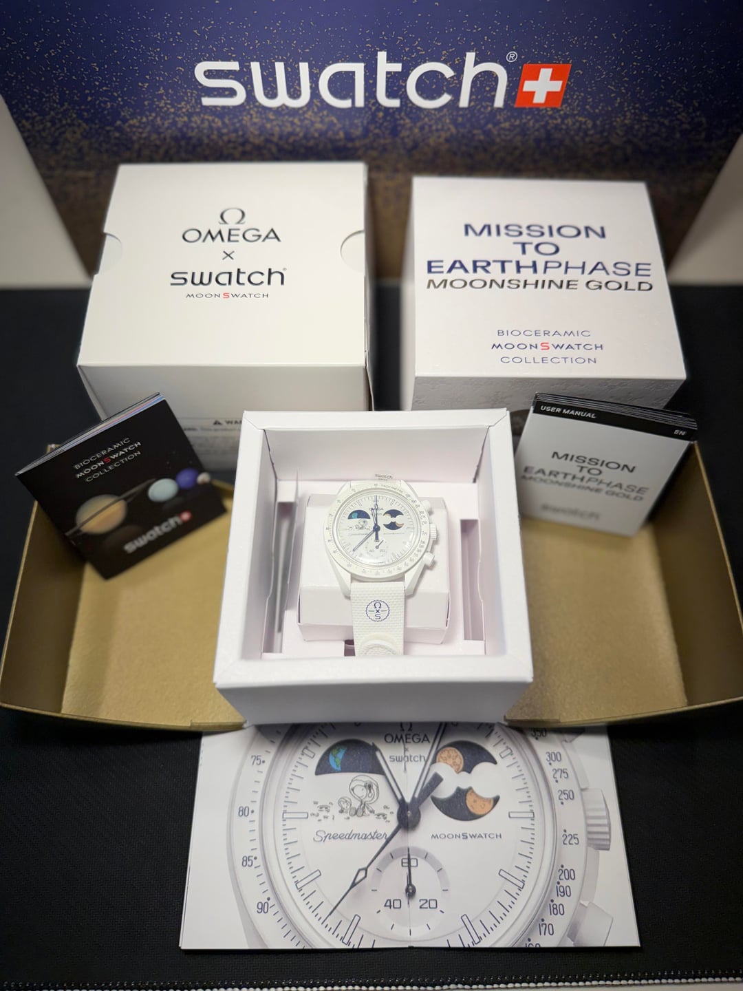 Turn heads with one of the most unique MoonSwatches ever made, the Mission to Earthphase: Moonshine Gold in crisp all-white Bioceramic with insane glow and rare details you don't see on the regular models.