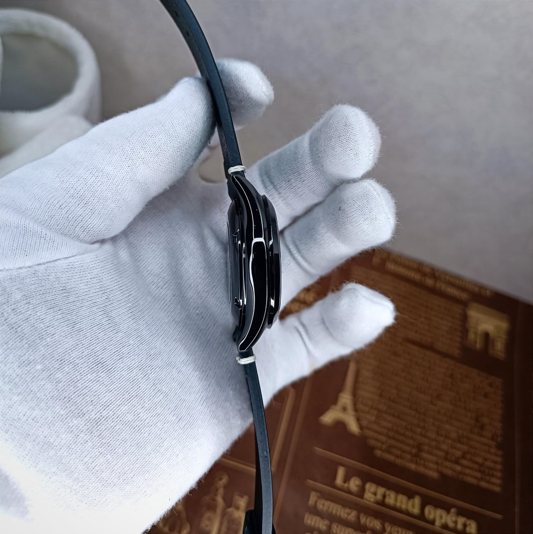 This watch features a full black ion-coated case paired with a unique sand-textured black dial, giving it a bold, cohesive, and stealthy appearance. It comes with a black leather strap and the original stainless steel bracelet, which has been previously used.